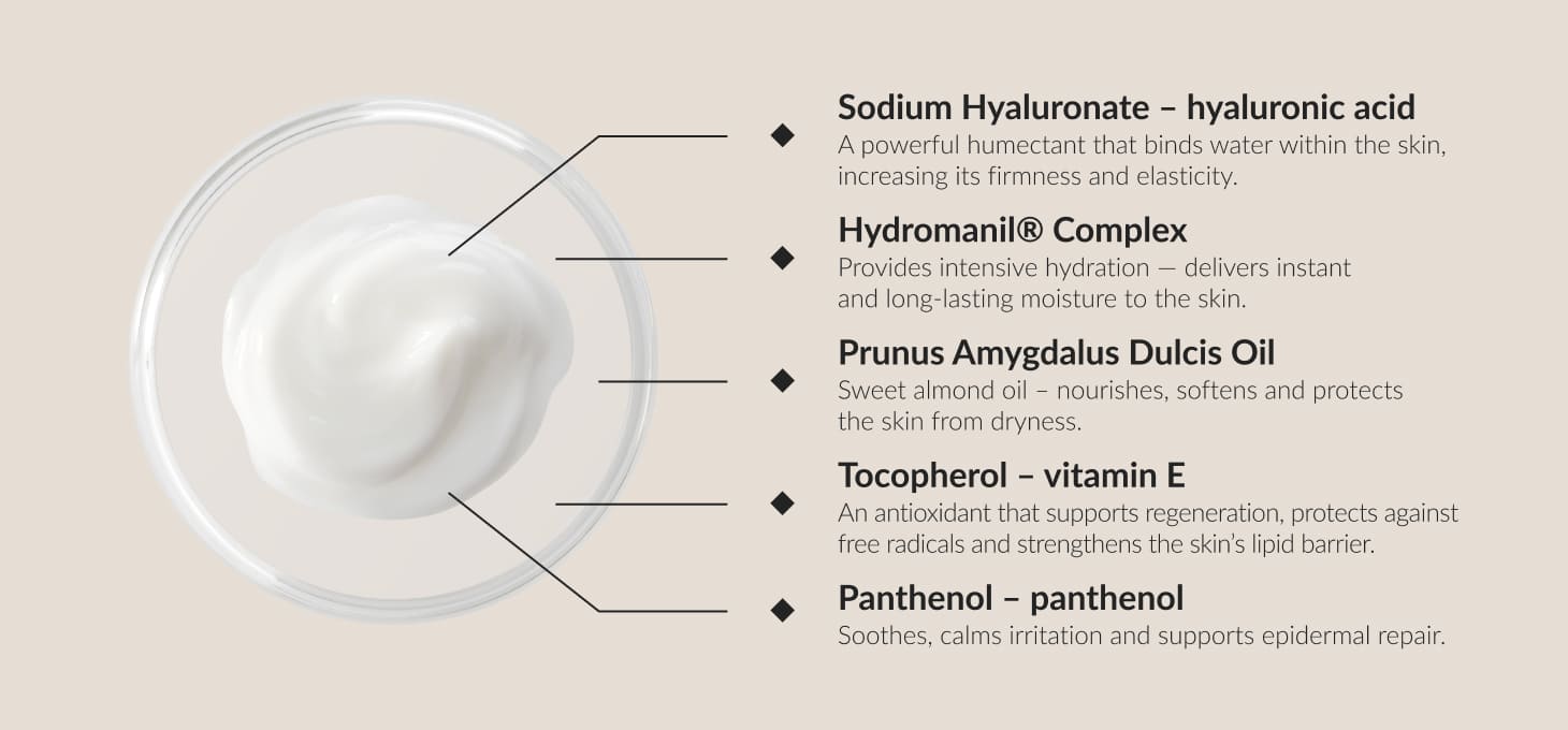 The mask combines low-molecular hyaluronic acid, which binds water in the deeper layers of the skin, with high-molecular hyaluronic acid, which forms a protective film on the skin's surface to prevent moisture loss. Hydromanil® and Pentavitin® complexes promote long-lasting, multi-level hydration - they act like a 'moisture magnet', retaining water and gradually releasing active substances.
