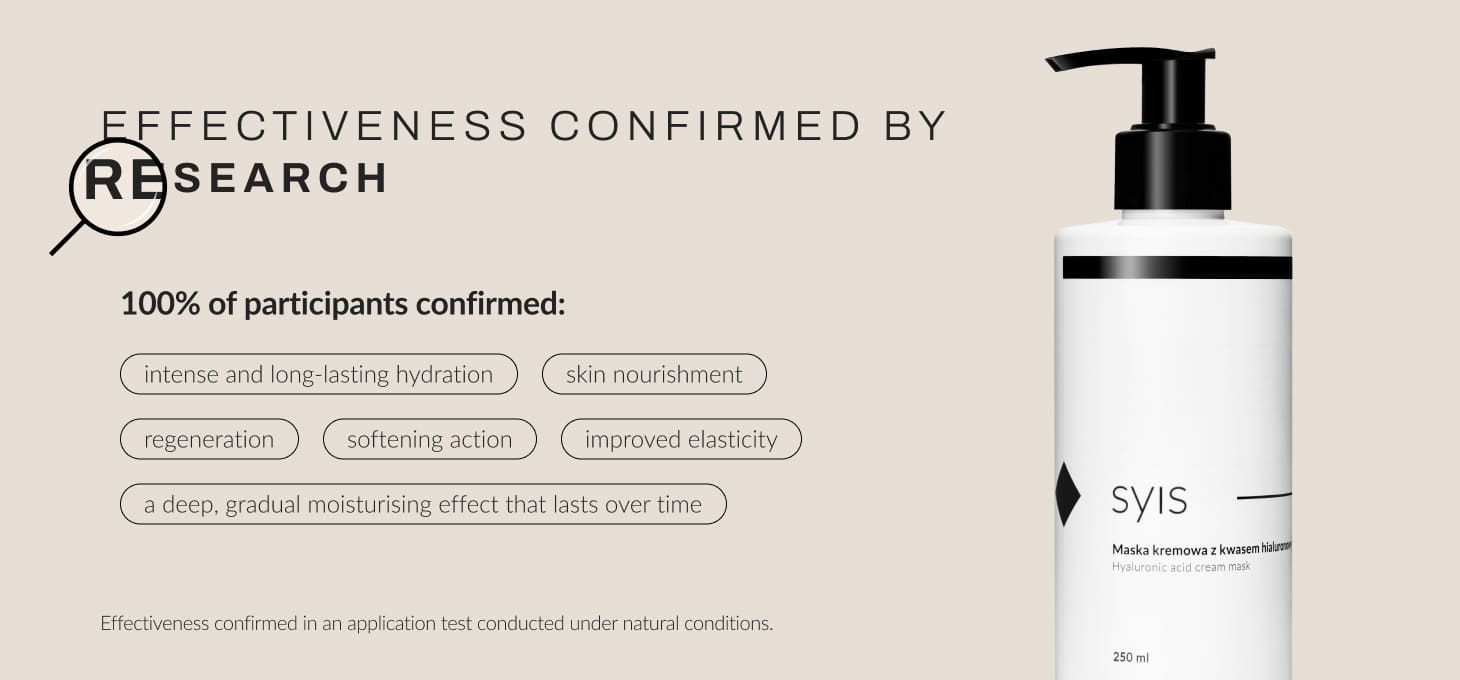 The formula of the SYIS cream mask with hyaluronic acid was developed for dehydrated, dry and lacklustre skin. It is perfect for both professional and home care - it intensively and long-lasting moisturises, restores elasticity and promotes regeneration.