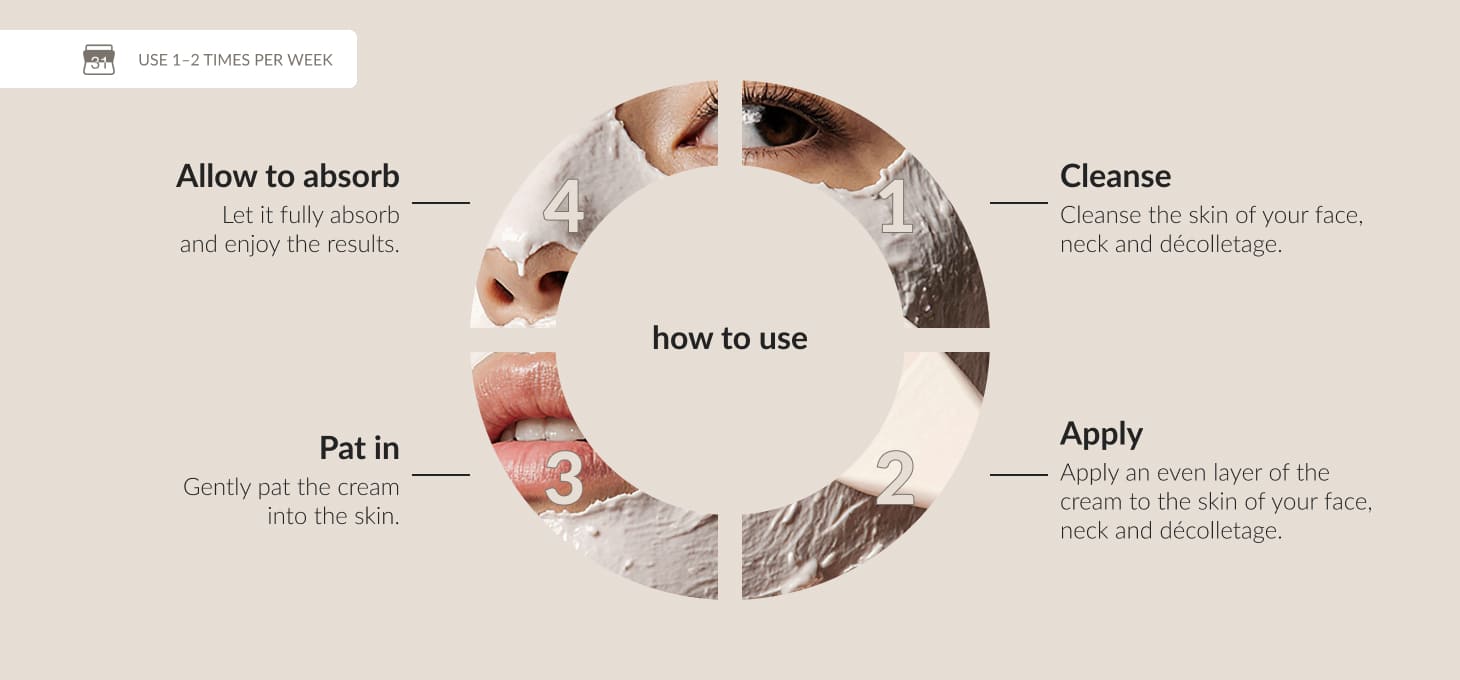 Apply an even, thin layer of mask to cleansed facial skin, avoiding the eye and lip areas. Leave on for 10-15 minutes, then wash off with lukewarm water. Use 1-2 times a week or according to individual skin needs.