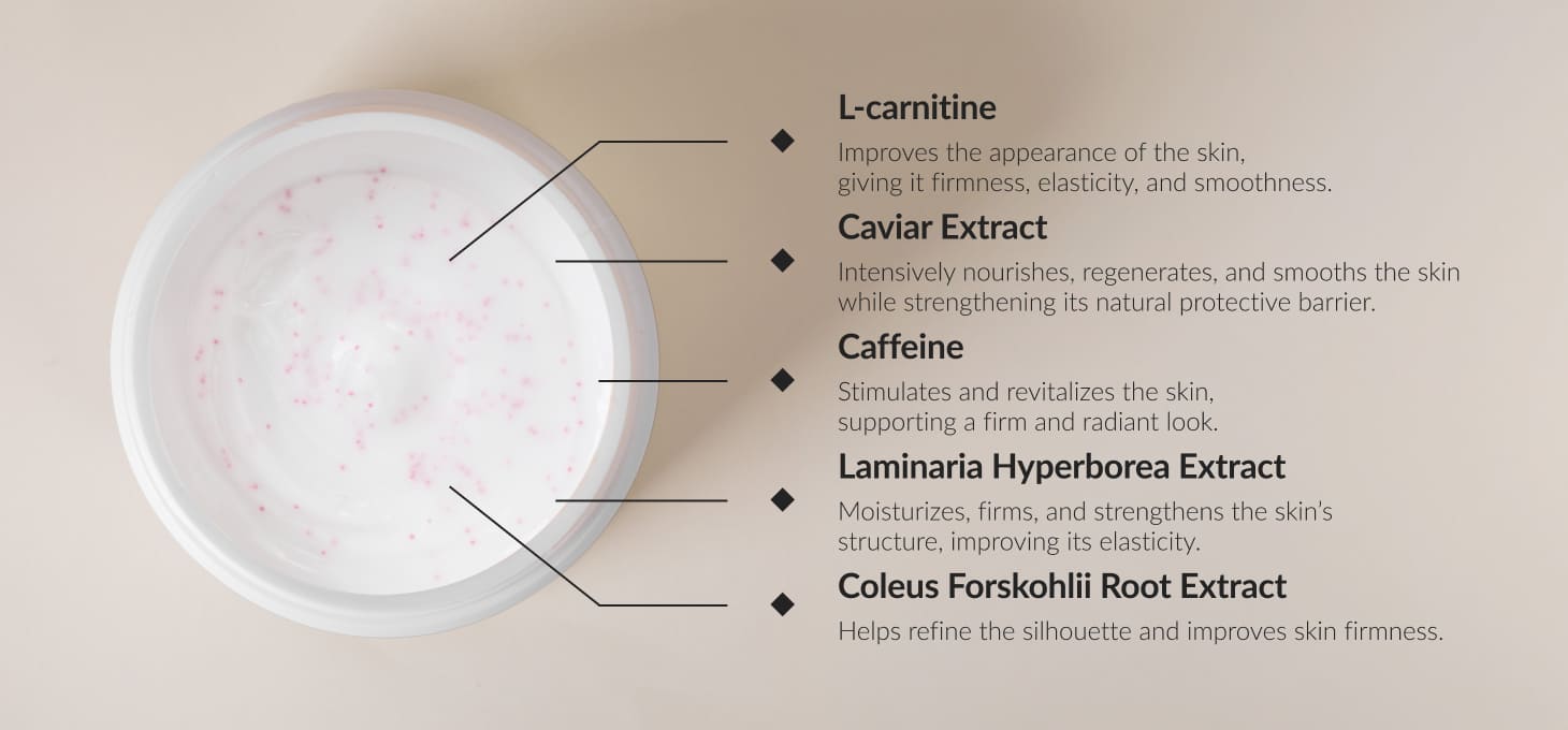 The balm's formula is enriched with highly active ingredients that support skin hydration, firming, and nourishment. L-carnitine improves skin firmness and smoothness, caffeine revitalises and supports firmness, while caviar extract intensively nourishes and smooths the epidermis. Laminaria Hyperborea algae extract moisturises, strengthens, and elasticises the skin, while Indian nettle root extract helps to shape the body, giving the skin a firm and healthy appearance.