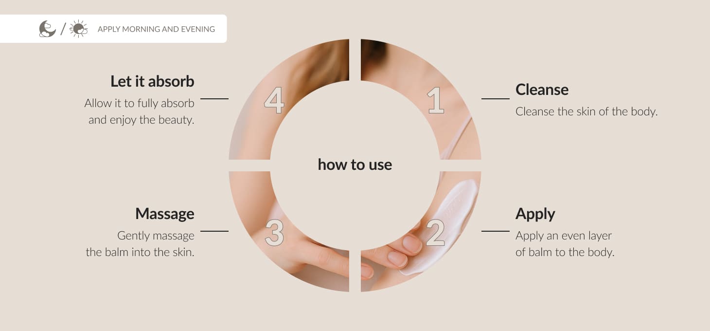 Apply the balm to cleansed skin and massage gently. Leave until fully absorbed. The product does not require rinsing.