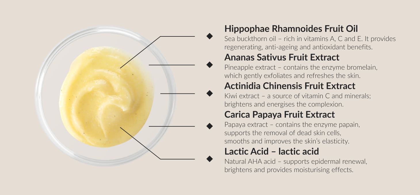 The advanced peeling formula combines the enzymatic action of papaya, kiwi and pineapple extracts with corundum particles, which mechanically remove dead skin cells and unblock pores. Lactic acid further supports the renewal process, gently brightens the complexion and improves skin texture, while raspberry extract and sea buckthorn oil provide vitamins and antioxidants to nourish and regenerate the skin.