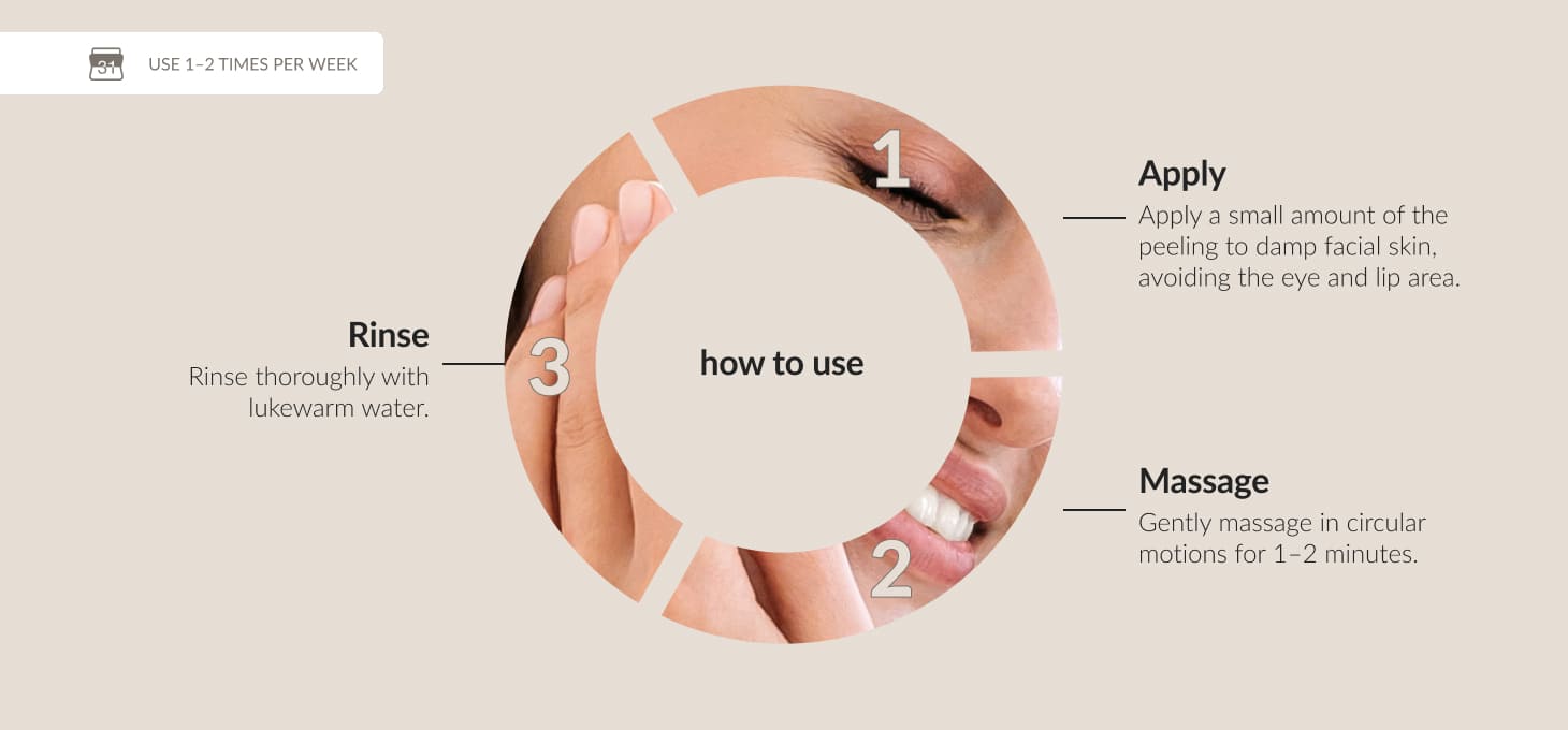 Apply a small amount of scrub to damp face, avoiding the eye and lip area. Gently massage in circular motions for 1-2 minutes, then rinse thoroughly with lukewarm water. Use 1-2 times a week or according to individual skin needs.