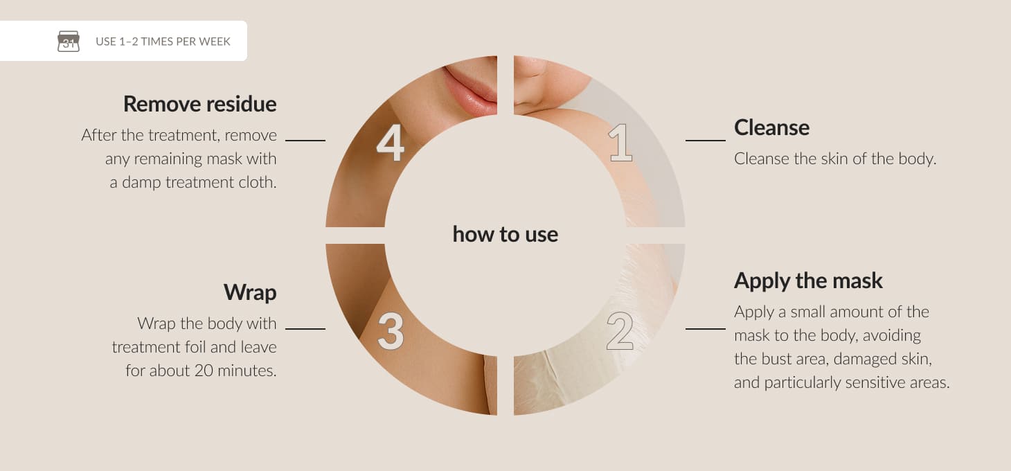 Apply a small amount of the mask to cleansed skin, avoiding the bust area, damaged skin and particularly sensitive areas. Wrap the body in a treatment foil and leave on for approximately 20 minutes. After the treatment, remove any residue with a damp treatment cloth.