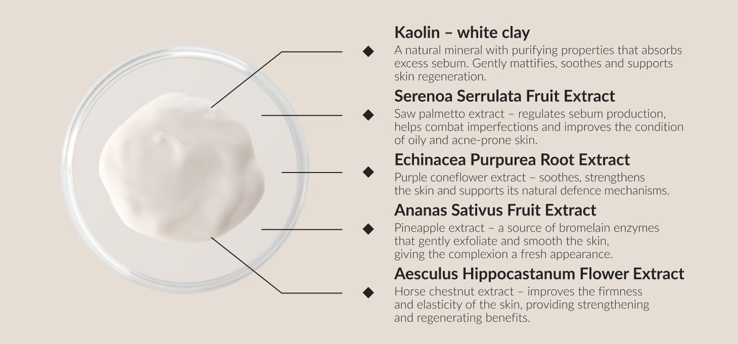 Ingredients (INCI): Aqua, Glycerin, Caprylic/Capric Triglyceride, Kaolin, Glyceryl Stearate, Cetearyl Alcohol, Propanediol, Cetyl Alcohol, Phenoxyethanol, Aesculus Hippocastanum Flower Extract, Ananas Sativus Fruit Extract, Prunus Amygdalus Dulcis Oil, Argania Spinosa Kernel Oil, Serenoa Serrulata Fruit Extract, Echinacea Purpurea Root Extract, Beta-Sitosterol, Azelaic Acid, Sesamum Indicum Seed Oil, Salicylic Acid, Olus Oil, Panthenol, Tocopherol, Xanthan Gum, Propylene Glycol, Ethylhexylglycerin, Sodium Benzoate, Potassium Sorbate, Parfum, Tetramethyl Acetyl Acetahydronaphthalenes, Hexamethylindanopyran.