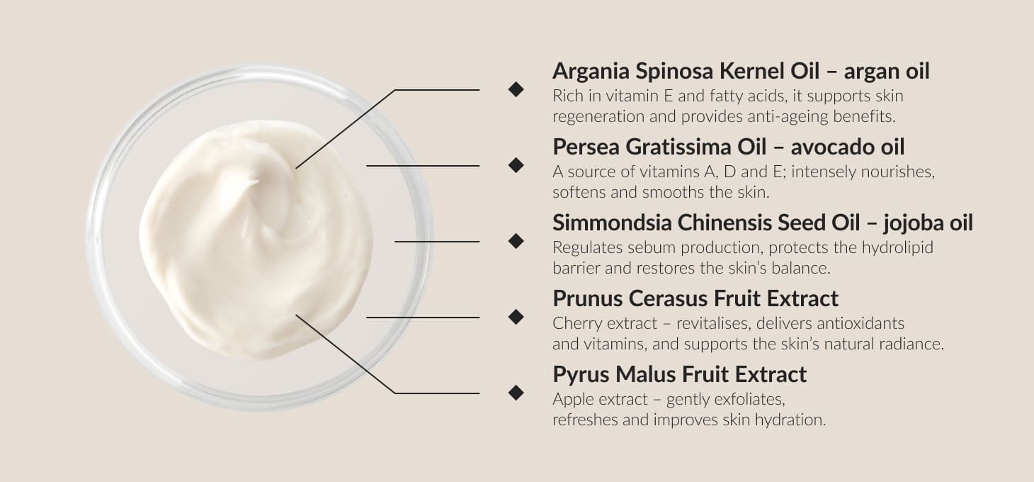 The combination of argan, avocado and jojoba oil intensively moisturises, firms and protects the skin from moisture loss. Vitamins C and E in the formula have an antioxidant effect, supporting the skin's natural renewal processes and protecting it from free radicals.