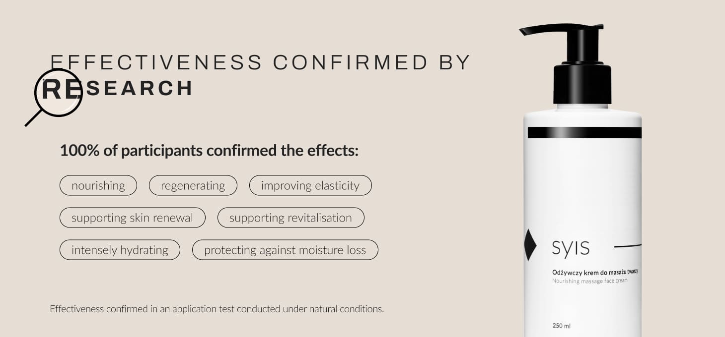 The product is safe for the skin and dermatologically tested. Its effectiveness was confirmed in an application test conducted under natural conditions - 100% of participants confirmed the skin nourishing and regenerating effect during a facial massage, as well as intense hydration, elasticity and protection against moisture loss. The test subjects also noted support for skin recovery and revitalisation, as well as ideal gliding during massage.