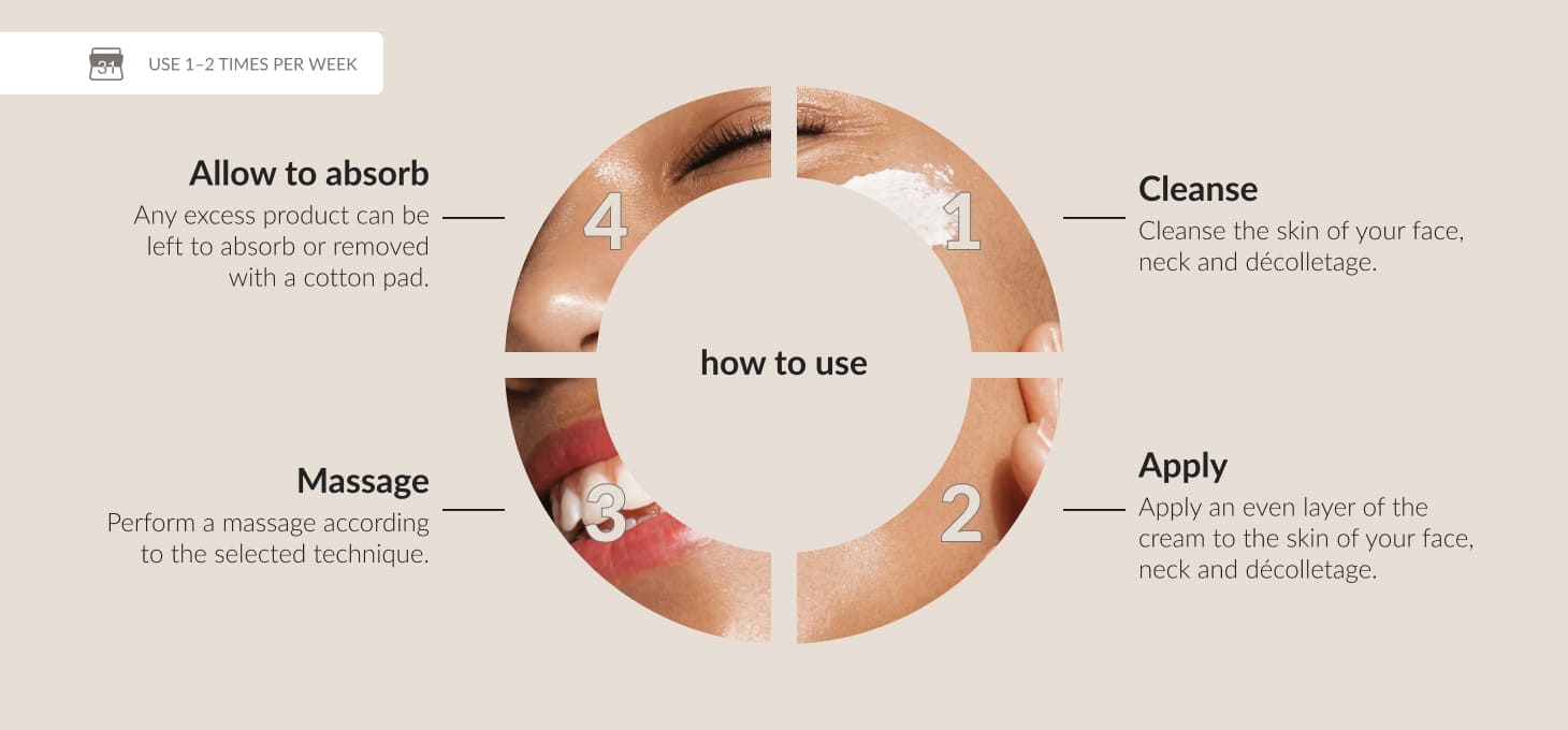 Spread the cream on cleansed skin on the face, neck and décolleté. Massage in according to your chosen technique. Excess product can be left to absorb or removed with a cotton pad.
