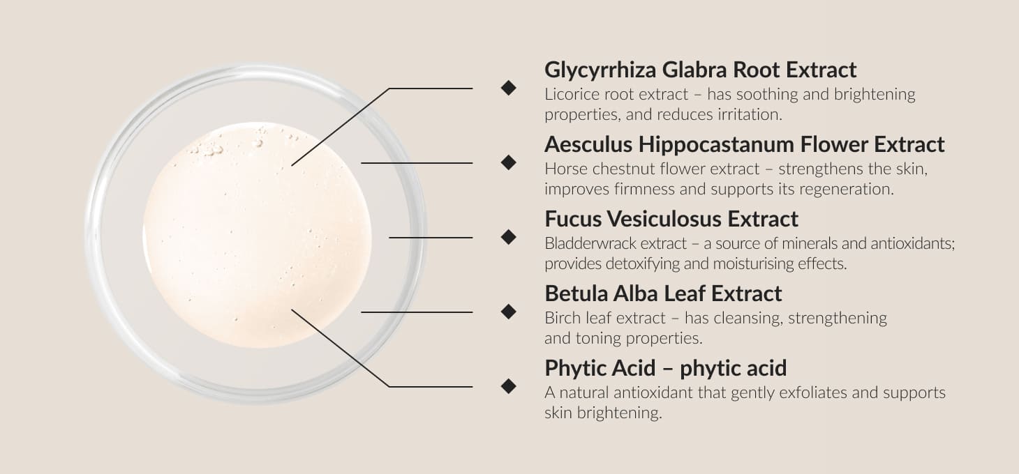 Birch leaf extract supports the natural cleansing processes, has a toning and strengthening effect. Phytic acid gently smoothes and regulates sebum secretion, restoring comfort and a healthy complexion.