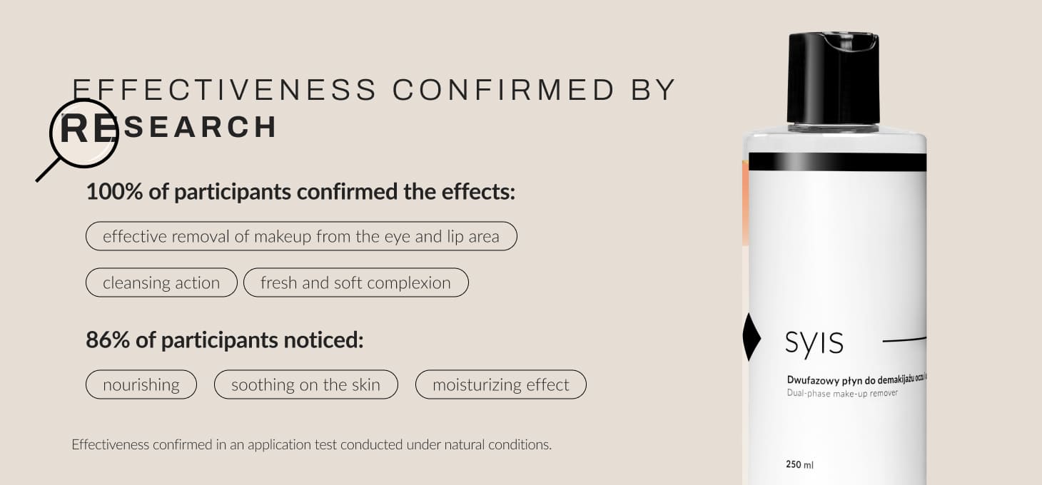 The product is safe for the skin and dermatologically tested. Effectiveness has been confirmed in a natural application test - 100% of participants confirmed effective removal of make-up from around the eyes and mouth, cleansing action and leaving the skin fresh and soft. 93% of participants noted a nourishing and soothing effect on the skin and 86% confirmed a moisturising effect.