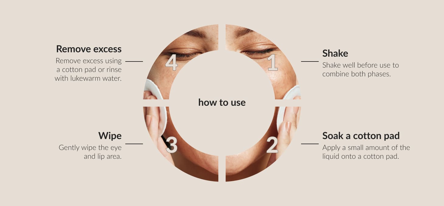 Shake vigorously before use to combine the two phases. Apply a small amount to a cotton pad and gently wipe around the eye and lip area. No rinsing required.