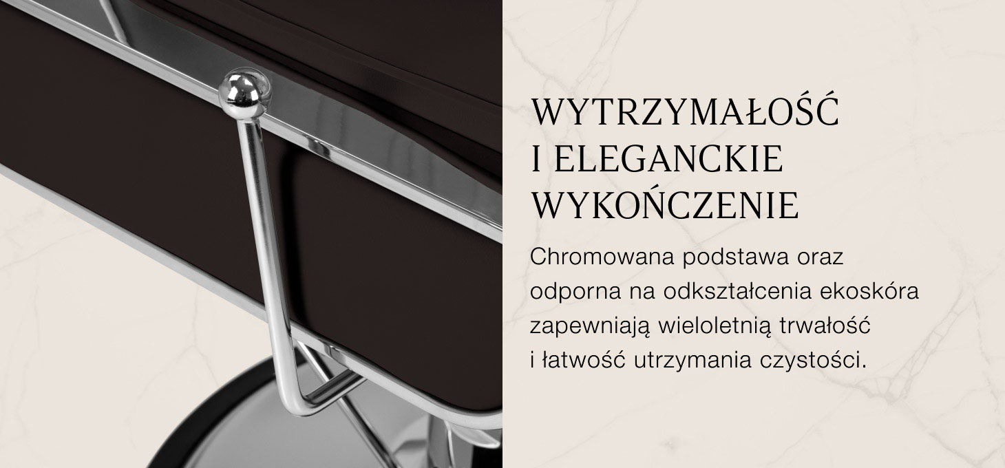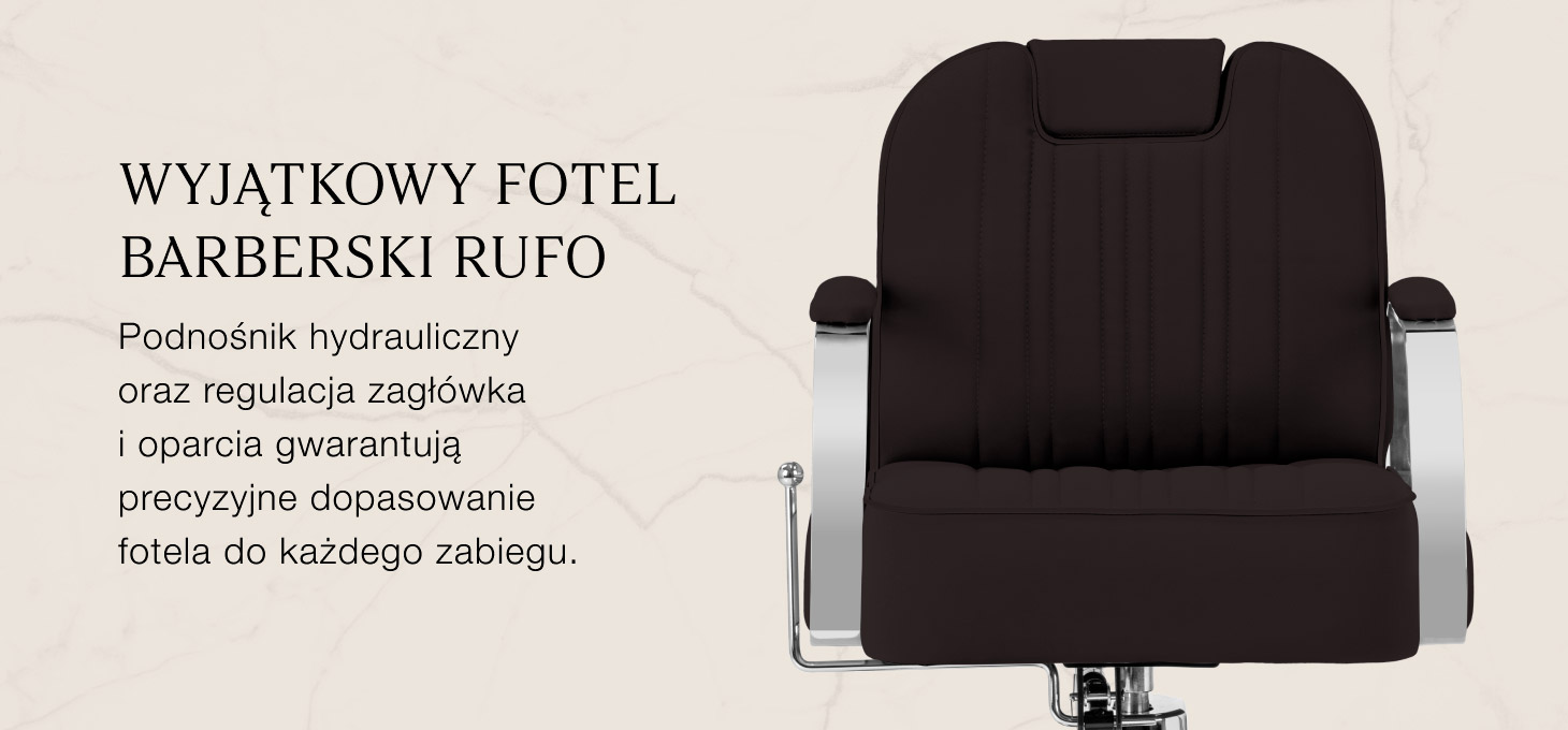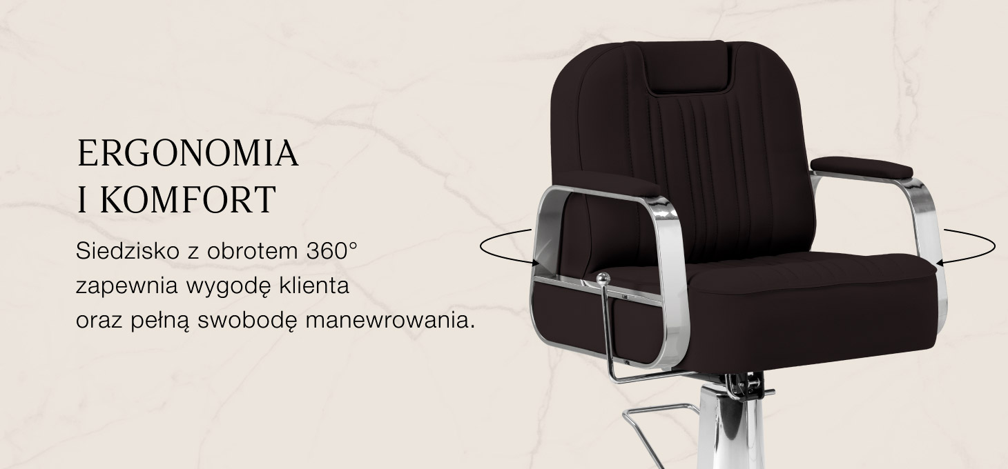 Stabilna podstawa w odcieniach chromu zapewnia pewne podparcie i wysoki komfort użytkowania. Wypełnienie z odpornej na odkształcenia pianki oraz obicie z przyjemnej w dotyku skóry syntetycznej zapewniają trwałość i komfortowe użytkowanie mebla przez długi czas. Materiały odporne na wilgoć i łatwe w czyszczeniu sprawiają, że fotel doskonale sprawdza się w codziennej pracy. Odcienie brązu, eleganckie przeszycia oraz chromowane detale nadają mu wyjątkowego charakteru, doskonale komponując się z wystrojem salonów barberskich.