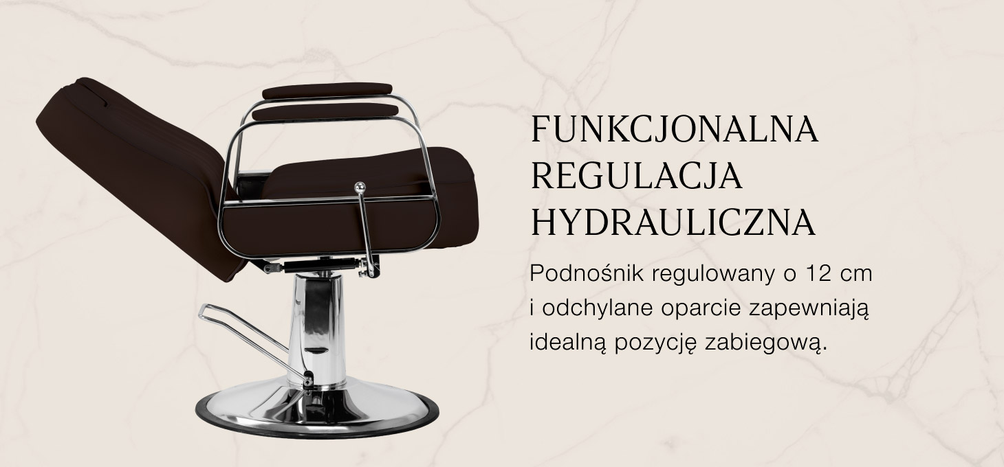 Wytrzymały podnośnik hydrauliczny umożliwia regulację wysokości siedziska o 12 cm, nawet w momencie, gdy klient siedzi w fotelu. Gwarantuje to bardziej ergonomiczną pracę, zapewniając możliwość dopasowania poziomu siedziska do wzrostu zarówno klienta, jak i osoby wykonującej zabieg. Odchylane oparcie umożliwia ułożenie klienta w wygodnej, półleżącej pozycji, co zapewnia lepszy dostęp podczas wybranych zabiegów. Dodatkowo wysuwany zagłówek gwarantuje stabilne podparcie głowy i możliwość dopasowania do indywidualnych potrzeb.