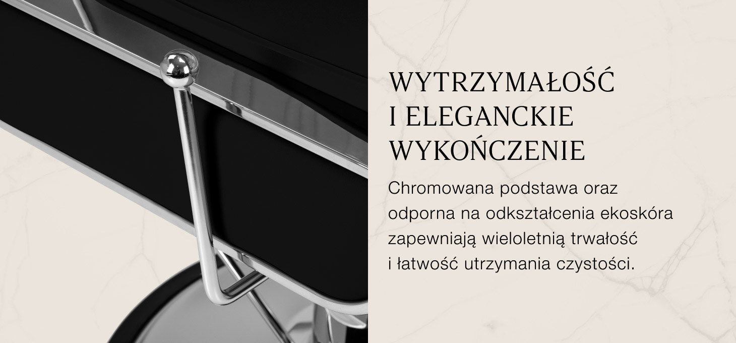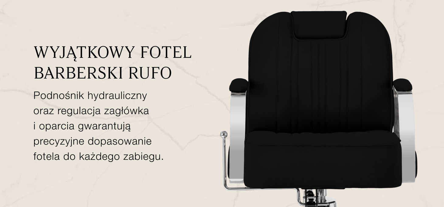 Stabilna podstawa w odcieniach chromu zapewnia pewne podparcie i wysoki komfort użytkowania. Wypełnienie z odpornej na odkształcenia pianki oraz obicie z przyjemnej w dotyku skóry syntetycznej zapewniają trwałość i komfortowe użytkowanie mebla przez długi czas. Materiały odporne na wilgoć i łatwe w czyszczeniu sprawiają, że fotel doskonale sprawdza się w codziennej pracy. Klasyczna czerń, eleganckie przeszycia oraz chromowane detale nadają mu wyjątkowego charakteru, doskonale komponując się z wystrojem salonów barberskich.