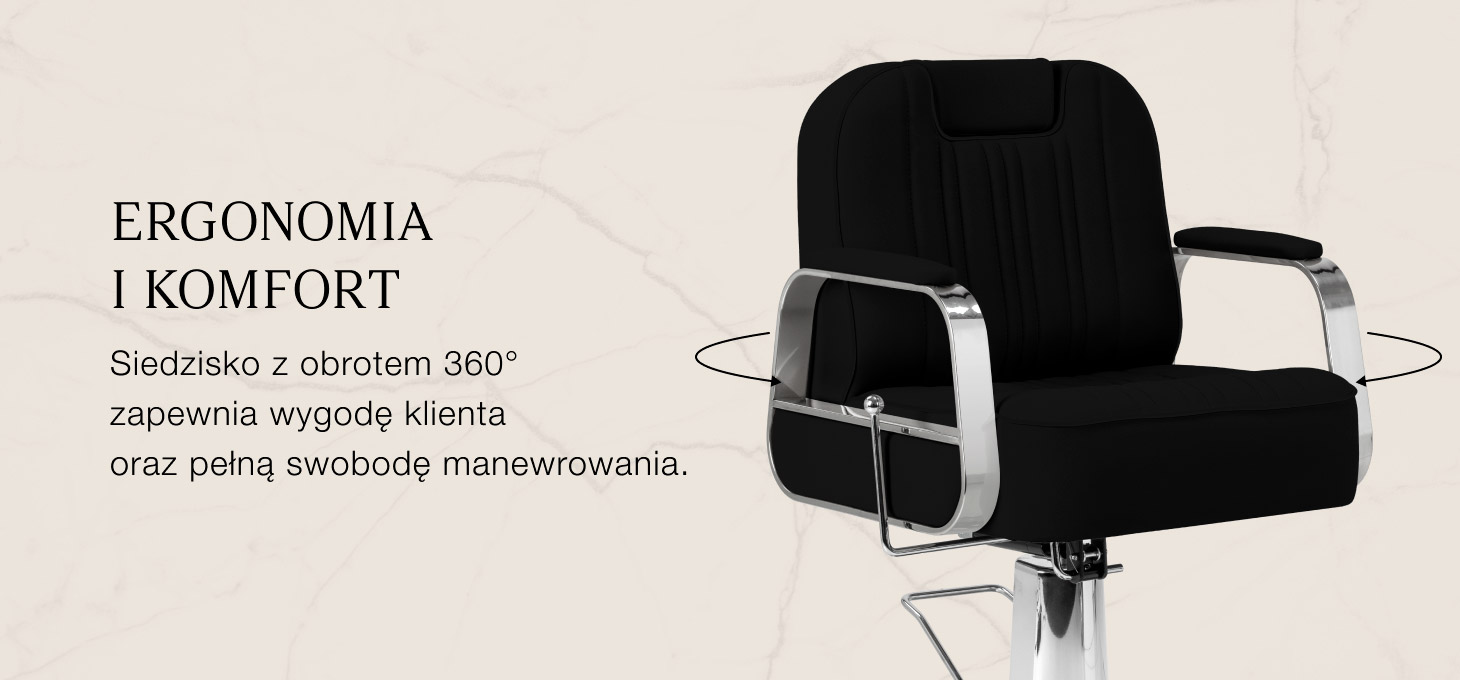 Komfortowe, miękkie siedzisko zapewnia wygodę nawet podczas dłuższych zabiegów, a ergonomiczne oparcie doskonale wspiera plecy, pozwalając klientowi zająć optymalną pozycję. Odpowiednio umieszczone podłokietniki umożliwiają prawidłowe ułożenie ramion, eliminując napięcie i poprawiając komfort. Mechanizm pełnego obrotu zwiększa swobodę ruchów, ułatwiając precyzyjną pracę i podnosząc efektywność usług.