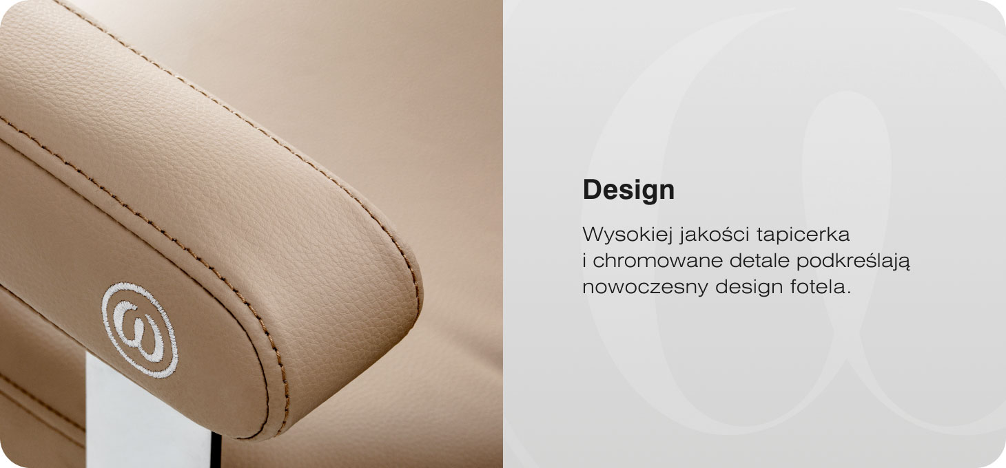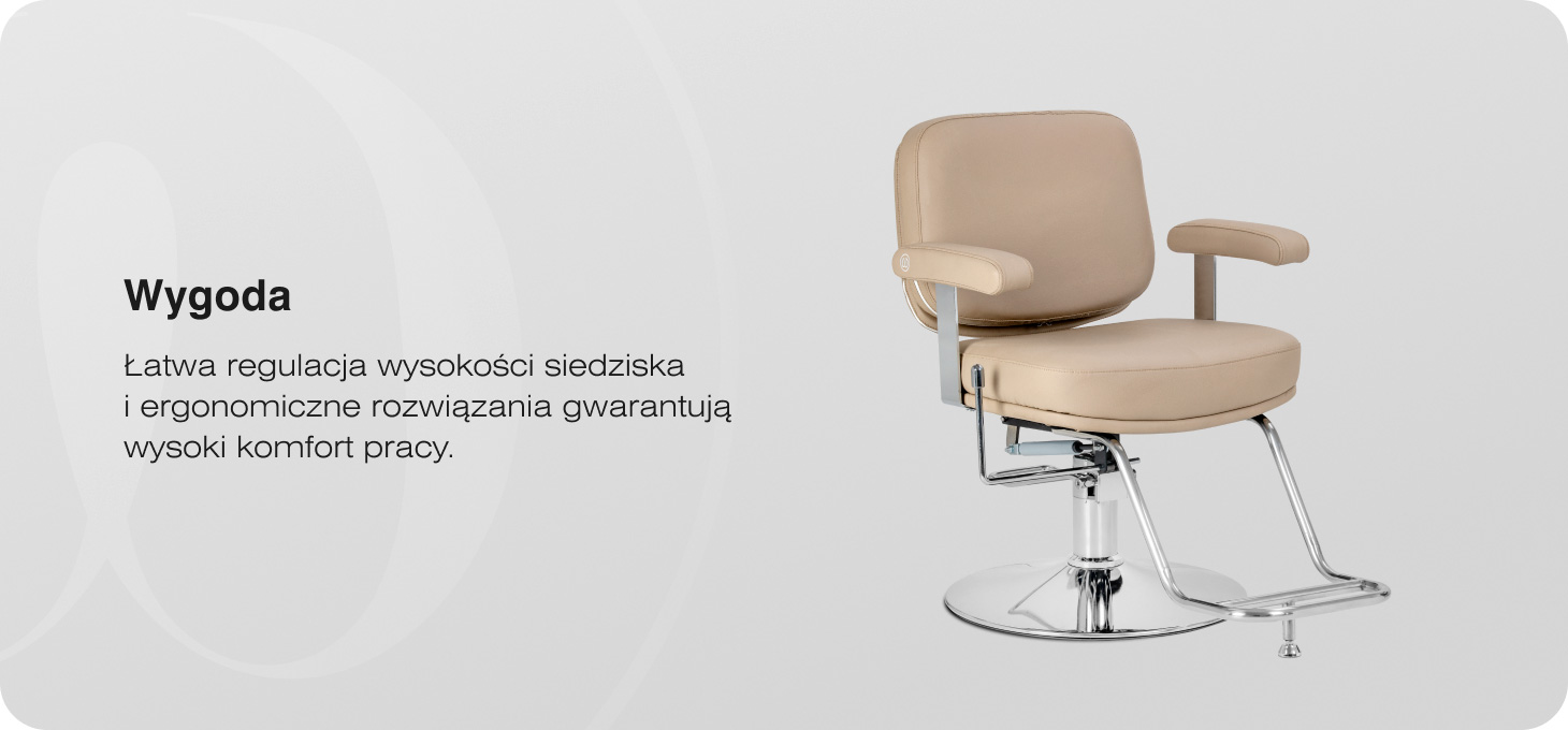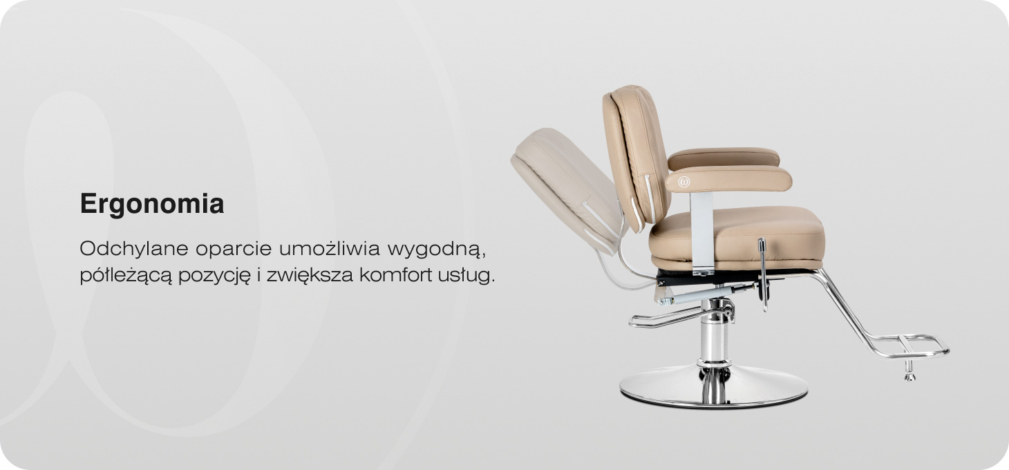 Konstrukcja fotela została zaprojektowana z myślą o komforcie klienta oraz wygodzie pracy stylisty. Odchylane oparcie pozwala na łatwe ułożenie klienta w wygodnej, półleżącej pozycji, co zwiększa komfort podczas wybranych usług. Ergonomiczne, tapicerowane podłokietniki zapewniają stabilne i wygodne podparcie rąk, a szeroka powierzchnia siedziska daje klientowi większą swobodę i poczucie komfortu. Mechanizm pełnego obrotu znacząco ułatwia pracę stylisty, umożliwiając sprawne manewrowanie wokół fotela i wygodny dostęp do klienta z każdej strony.