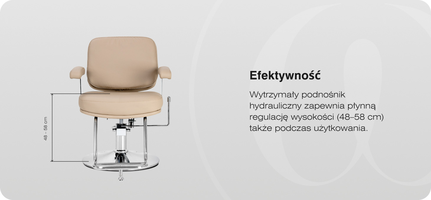 Wytrzymały podnośnik hydrauliczny pozwala na płynną regulację wysokości siedziska w zakresie 48-58 cm, również w trakcie użytkowania fotela. Ułatwia to ergonomiczne dopasowanie pozycji do wzrostu klienta oraz stylisty, zwiększając wygodę i efektywność pracy. Wyprofilowane oparcie stabilnie podpiera plecy, pomagając utrzymać komfortową pozycję nawet podczas dłuższych usług fryzjerskich. Zintegrowany podnóżek zapewnia wygodne i stabilne podparcie stóp, co wpływa na pozytywne doświadczenie podczas wizyty w salonie.