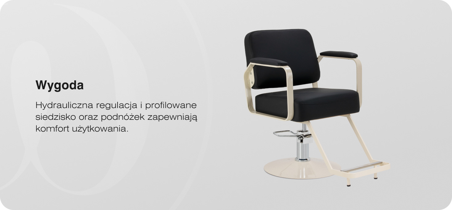 Konstrukcja fotela zaprojektowana została z myślą o komforcie podczas wielogodzinnej pracy w salonie. Grube, miękkie siedzisko oraz ergonomiczne metalowe podłokietniki, częściowo pokryte tapicerką, wspierają naturalną postawę klienta i ułatwiają precyzyjne wykonywanie usług fryzjerskich. Mechanizm pełnego obrotu zwiększa swobodę ruchów, co przekłada się na sprawniejszą i bardziej efektywną pracę. Praktyczna przestrzeń między siedziskiem a oparciem ułatwia szybkie usuwanie włosów, pomagając utrzymać stanowisko w czystości.
