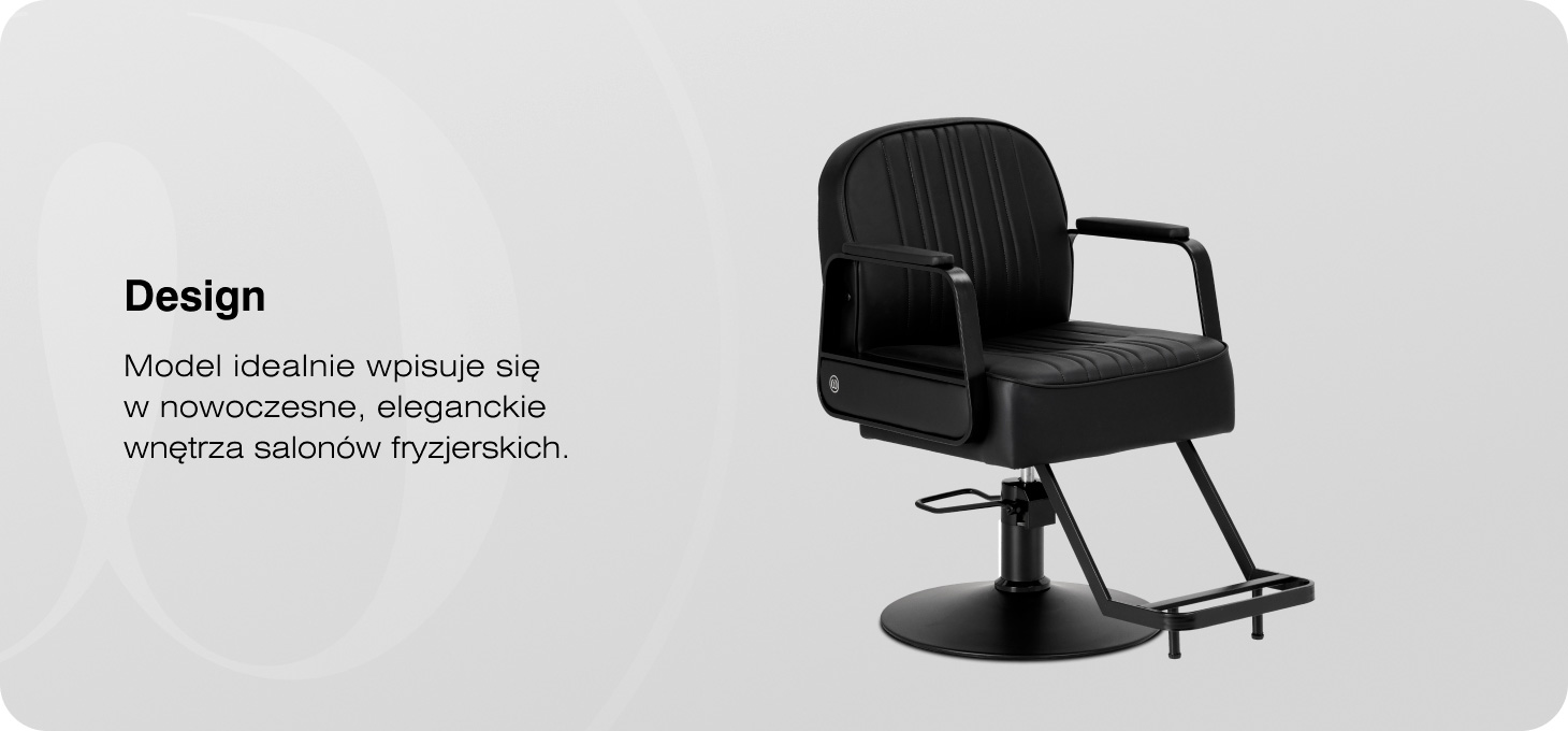 Fotel wyróżnia się minimalistycznym designem inspirowanym stylem industrialnym, który doskonale podkreśla profesjonalny charakter salonu. Tapicerka z wysokiej jakości skóry syntetycznej w klasycznej czerni, ozdobiona pionowymi przeszyciami, nadaje całości elegancki wygląd. Materiał obicia wyróżnia się trwałością, odpornością na wilgoć oraz łatwością utrzymania w czystości, co przekłada się na estetyczny wygląd fotela nawet przy intensywnym użytkowaniu. Metalowe podłokietniki z miękkimi nakładkami współgrają z nowoczesną linią konstrukcji, zapewniając wygodne podparcie rąk. Matowa, czarna podstawa oraz dopasowany podnóżek tworzą spójną, stylową formę, która świetnie komponuje się zarówno z nowoczesnymi, jak i bardziej klasycznymi aranżacjami salonów fryzjerskich i barberskich.