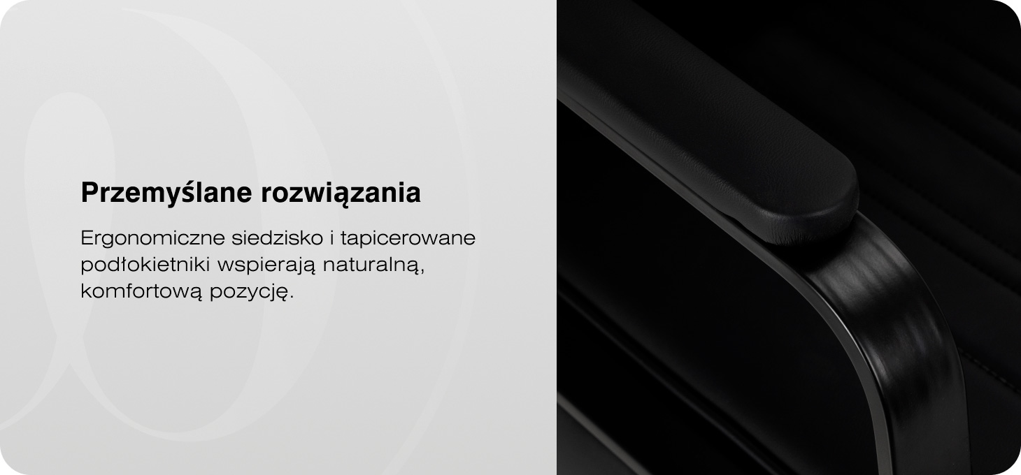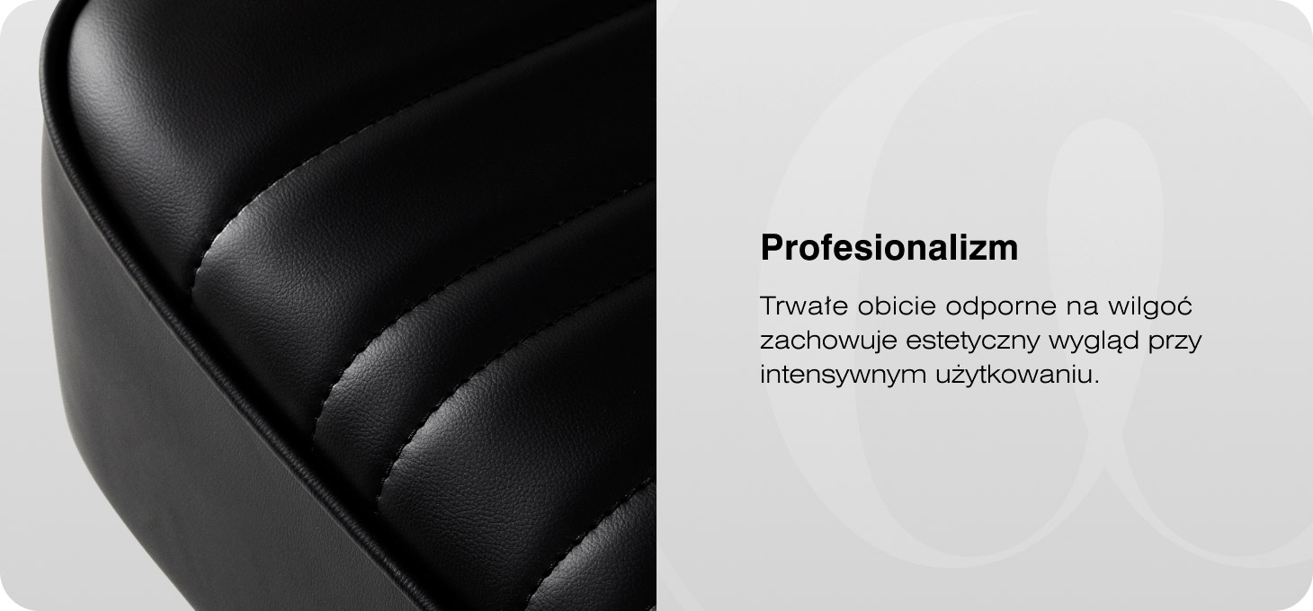 Konstrukcja fotela zapewnia komfort nawet podczas dłuższych zabiegów. Odpowiednio wyprofilowane siedzisko oraz ergonomiczne, tapicerowane podłokietniki wspierają naturalne ułożenie ciała klienta, zapewniając stabilne podparcie oraz wygodę. Mechanizm pełnego obrotu zwiększa zakres ruchu, ułatwiając swobodne manewrowanie wokół fotela i sprawną pracę.