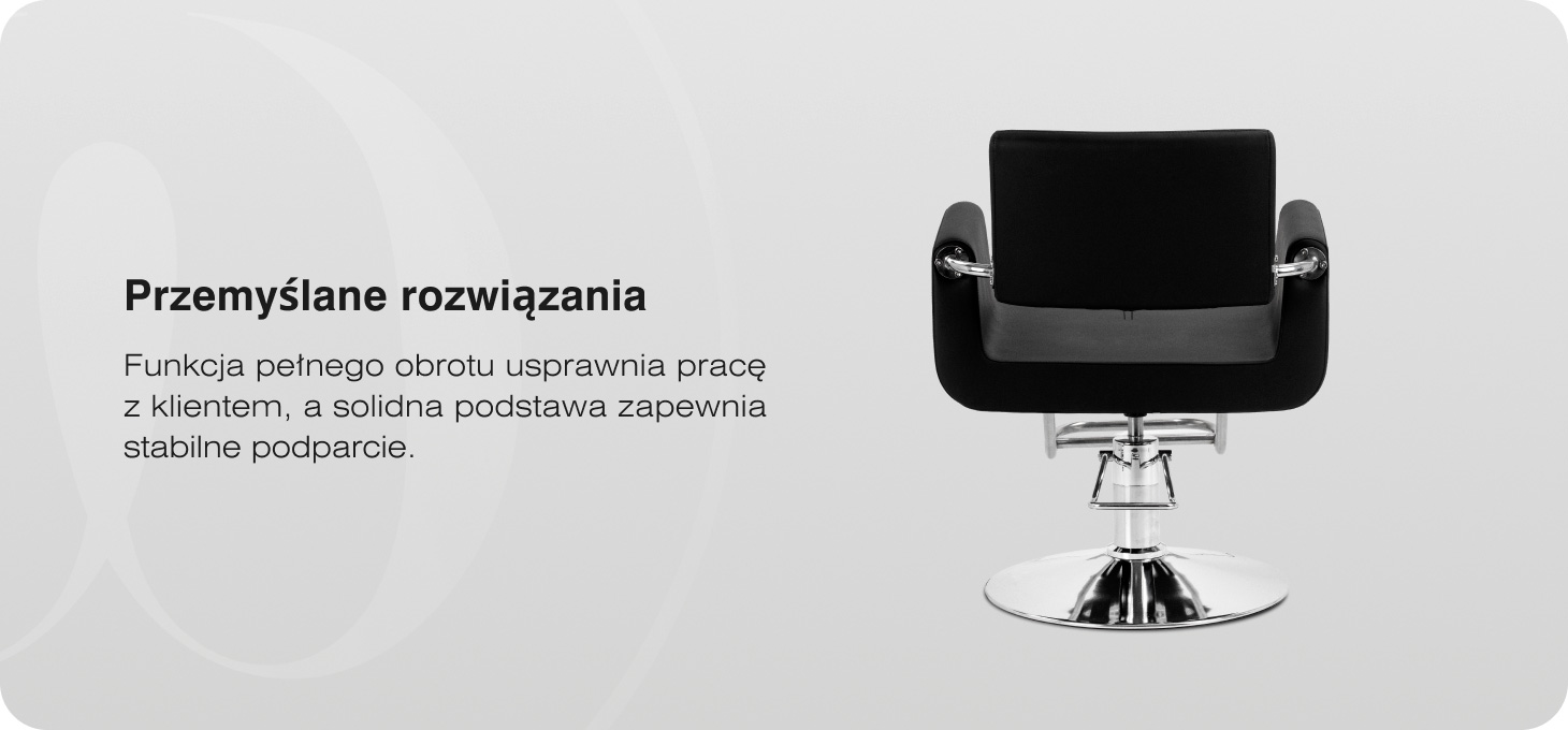 Odpowiednio wyprofilowane siedzisko oraz ergonomiczne, tapicerowane podłokietniki wspierają naturalne ułożenie ciała klienta, zapewniając stabilne podparcie i wygodę. Otwarta przestrzeń pomiędzy siedziskiem a oparciem ułatwia utrzymanie czystości stanowiska pracy, umożliwiając szybkie usunięcie włosów. Mechanizm pełnego obrotu zwiększa swobodę pracy, ułatwiając wykonywanie zabiegów z różnych stron fotela. Stabilna podstawa zapewnia bezpieczeństwo i pewne podparcie podczas codziennego użytkowania.