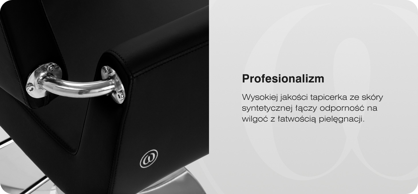 Model wyróżnia się minimalistyczną stylistyką inspirowaną nowoczesnym stylem. Tapicerka z wysokiej jakości skóry syntetycznej w klasycznej czerni nadaje całości elegancki wygląd, a jej powierzchnia wyróżnia się odpornością na wilgoć oraz łatwością utrzymania w czystości. Podstawa oraz metalowy podnóżek podkreślają nowoczesny charakter fotela, tworząc spójną i estetyczną formę, która dobrze komponuje się z różnorodnymi aranżacjami salonów fryzjerskich i barberskich.