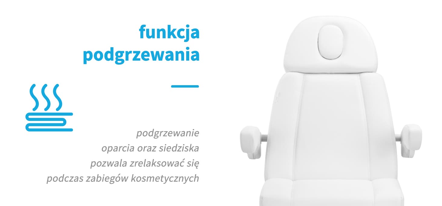 Fotel wyposażony jest w opcję podgrzewania oparcia oraz siedziska. Ciepło pomaga rozluźnić mięśnie i powoduje przyjemne odczucia, co może pomóc w zrelaksowaniu się podczas zabiegów kosmetycznych. Podgrzewanie pomaga w rozszerzeniu naczyń krwionośnych, co może zwiększyć przepływ krwi do obszaru, który jest poddawany zabiegowi, poprawiając efektywność wielu zabiegów kosmetycznych.