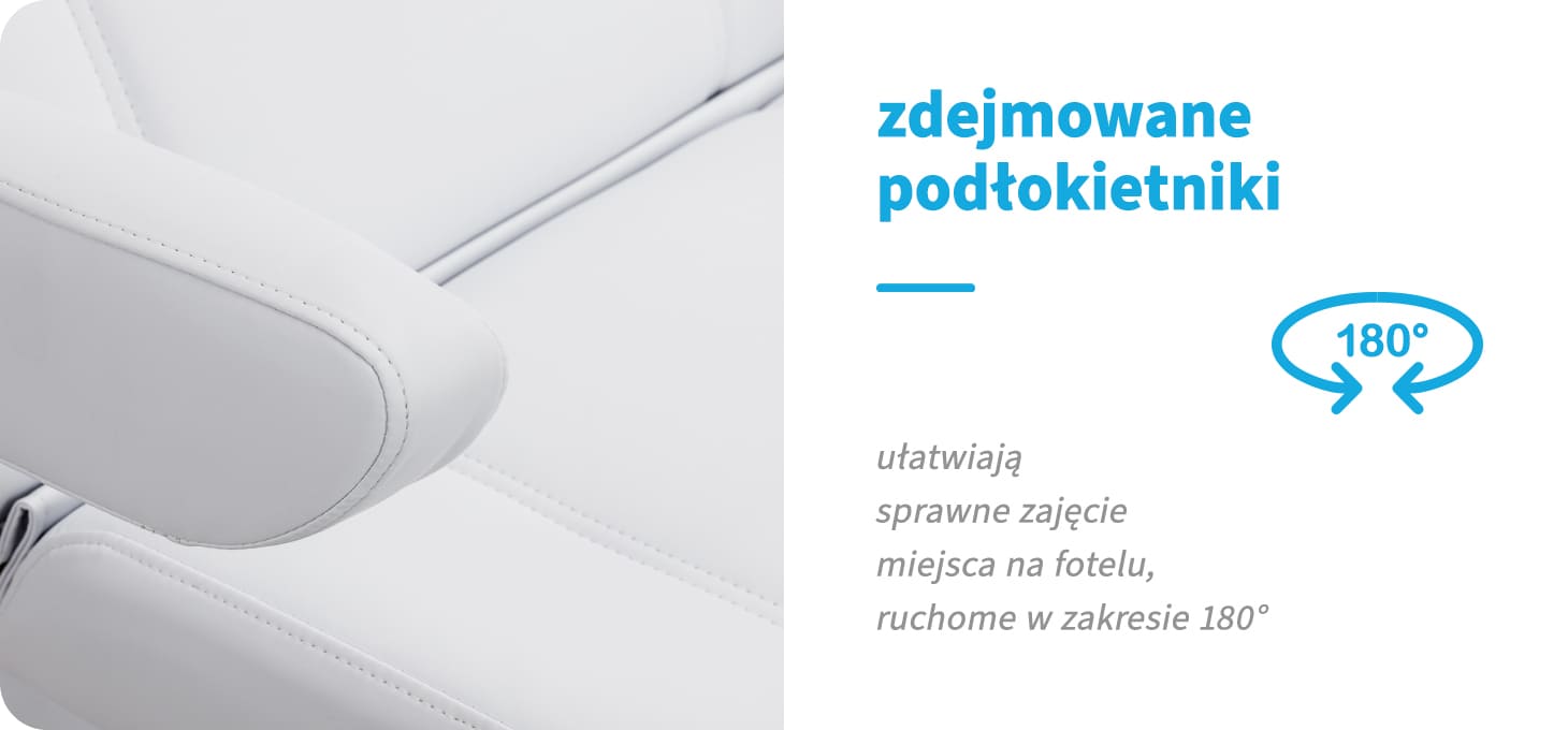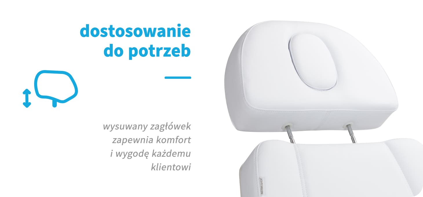 Szerokie siedzisko zapewnia wygodę nawet podczas długotrwałych zabiegów. Łatwe w demontażu, ruchome podłokietniki z możliwością obrotu w zakresie 180° ułatwiają klientowi zajęcie miejsca na fotelu oraz zapewniają swobodny dostęp osobie wykonującej usługę. Fotel wyposażono również w regulowany zagłówek, który gwarantuje stabilne podparcie głowy i dodatkowy komfort, zwłaszcza przypadku wyższych użytkowników.