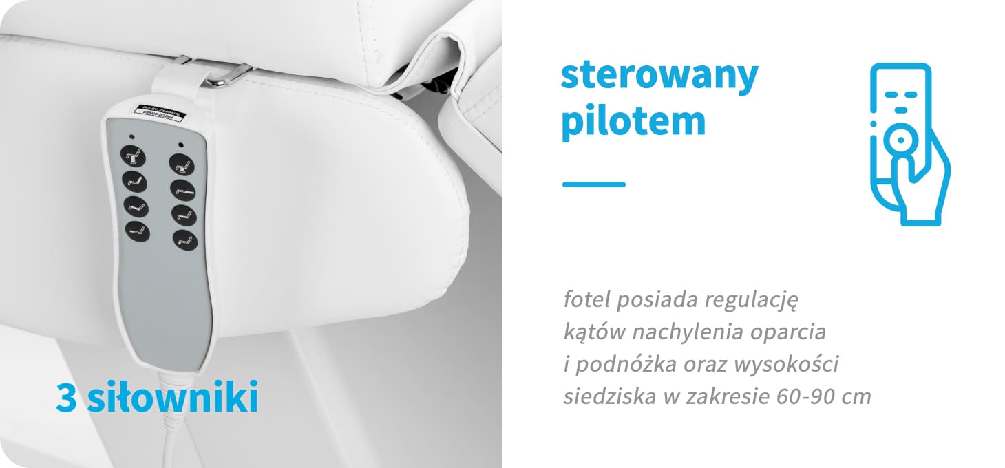 Sterowanie za pomocą pilota przewodowego pozwala na precyzyjne ustawienie fotela w trzech płaszczyznach: regulacji wysokości, kąta nachylenia oparcia oraz kołyski. Taki zakres regulacji umożliwia dopasowanie pozycji do rodzaju wykonywanego zabiegu – zarówno pod względem komfortu klienta, jak i ergonomii pracy specjalisty. Dla wygody użytkowania pilot można zawiesić na uchwytach umieszczonych po obu stronach siedziska.