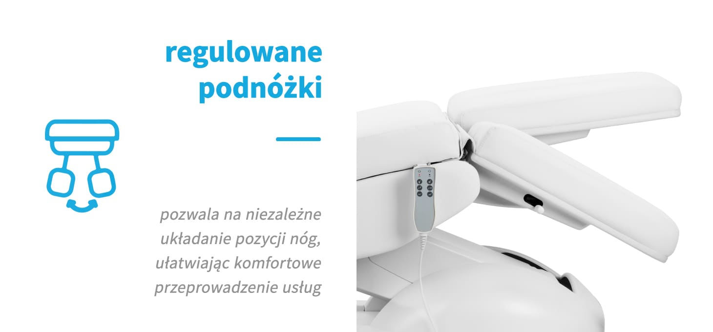 Fotel został starannie zaprojektowany z myślą o specjalistach w dziedzinie podologii. Dzielony podnóżek umożliwia niezależne ustawienie każdej nogi, co znacząco ułatwia precyzyjne i komfortowe wykonywanie zabiegów. Regulacja kąta nachylenia poszczególnych stron odbywa się manualnie, co pozwala na szybkie dostosowanie pozycji do potrzeb zarówno klienta, jak i osoby wykonującej usługę.