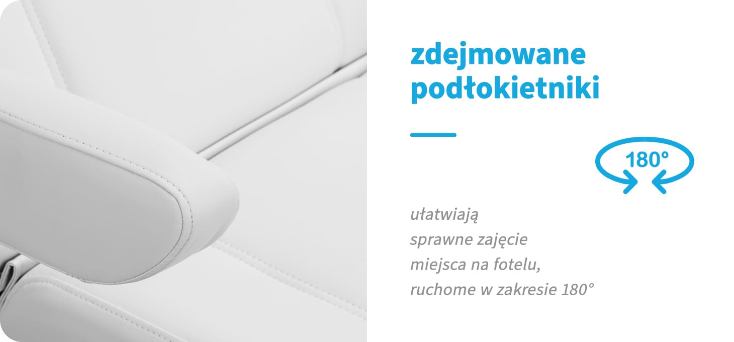 Szerokie siedzisko zapewnia wygodę nawet podczas długotrwałych zabiegów. Łatwe w demontażu, ruchome podłokietniki z możliwością obrotu w zakresie 180° ułatwiają klientowi zajęcie miejsca na fotelu oraz zapewniają swobodny dostęp osobie wykonującej usługę. Fotel wyposażono również w regulowany zagłówek, który gwarantuje stabilne podparcie głowy i dodatkowy komfort, zwłaszcza w przypadku wyższych użytkowników.