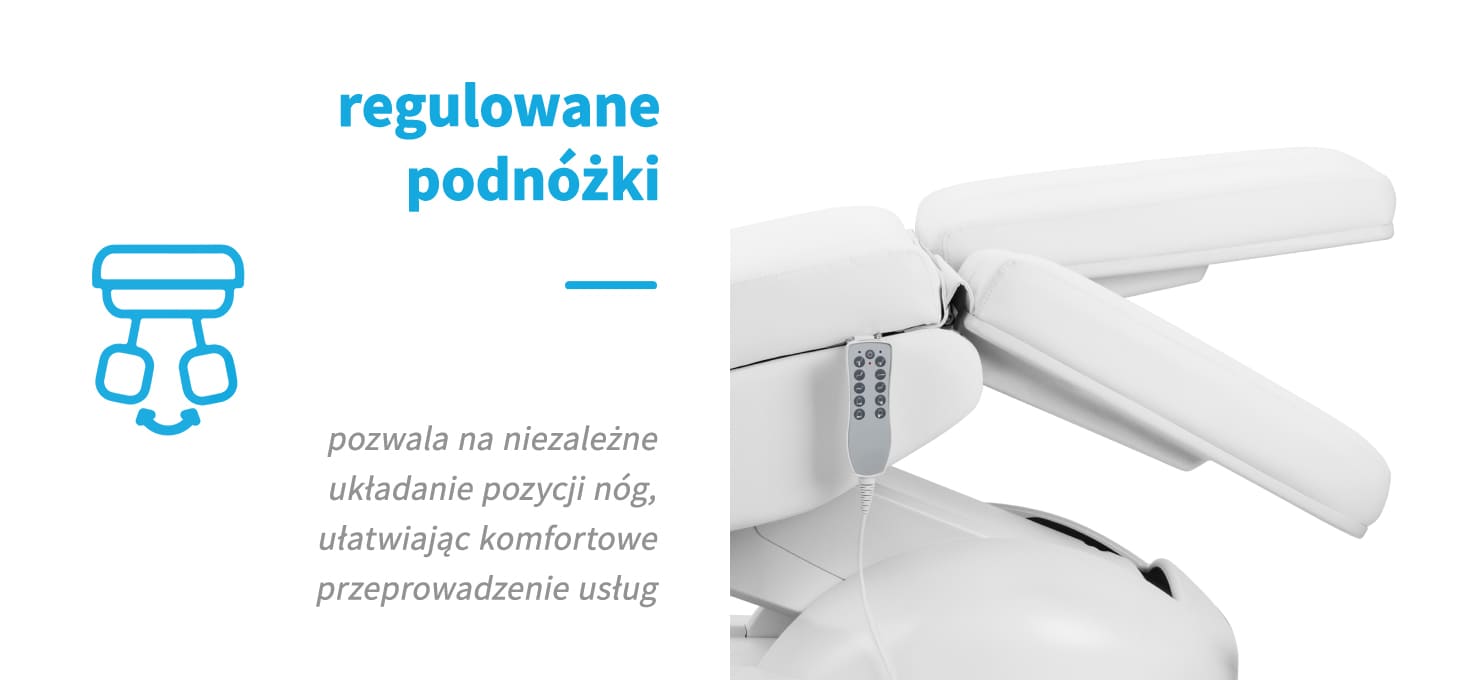 Fotel został starannie zaprojektowany z myślą o specjalistach w dziedzinie podologii. Dzielony podnóżek umożliwia niezależne ustawienie każdej nogi, co znacząco ułatwia precyzyjne i komfortowe wykonywanie zabiegów. Regulacja kąta nachylenia poszczególnych stron odbywa się z użyciem pilota, co pozwala na szybkie dostosowanie pozycji do potrzeb zarówno klienta, jak i osoby wykonującej usługę.