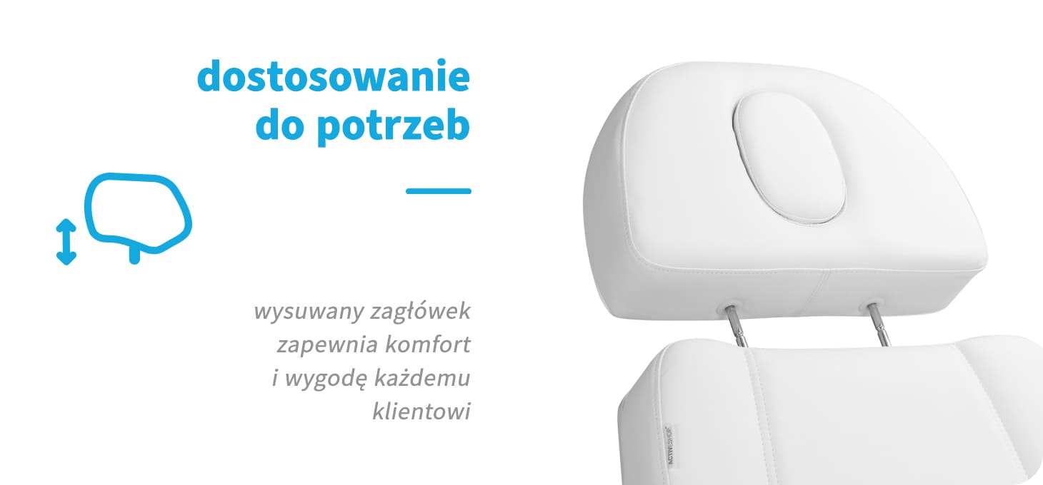Szerokie siedzisko zapewnia wygodę nawet podczas długotrwałych zabiegów. Łatwe w demontażu, ruchome podłokietniki z możliwością obrotu w zakresie 180° ułatwiają klientowi zajęcie miejsca na fotelu oraz zapewniają swobodny dostęp osobie wykonującej usługę. Fotel wyposażono również w regulowany zagłówek, który gwarantuje stabilne podparcie głowy i dodatkowy komfort, zwłaszcza przypadku wyższych użytkowników.