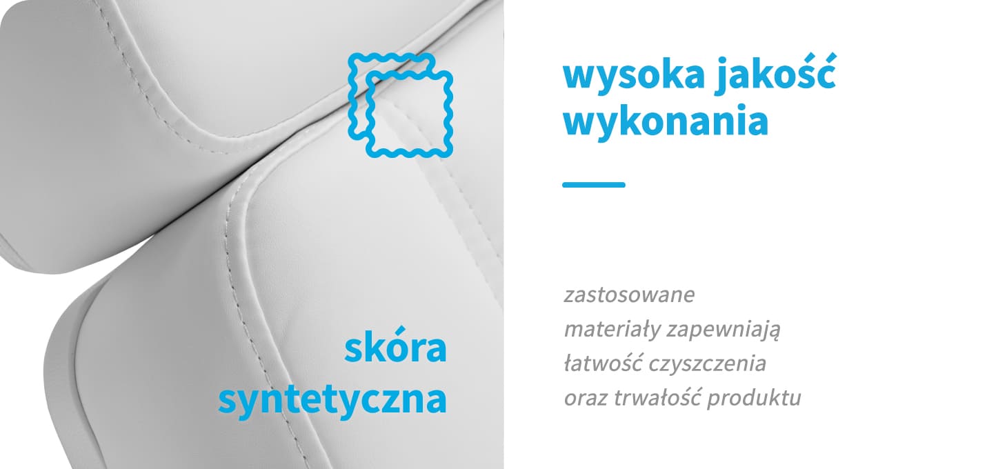 Solidna konstrukcja fotela zapewnia stabilność i wytrzymałość w codziennym użytkowaniu. Siedzisko wypełnione pianką o odpowiednio dobranej twardości gwarantuje komfort nawet podczas długotrwałych zabiegów. Obicie z wysokiej jakości, przyjemnej w dotyku imitacji skóry w odcieniach bieli nadaje całości profesjonalny wygląd, a jednocześnie jest odporne na wilgoć i łatwe w utrzymaniu czystości. Trwała podstawa gwarantuje stabilność, a precyzyjne wykończenia podkreślają nowoczesny charakter fotela i zwiększają ergonomię siedziska.