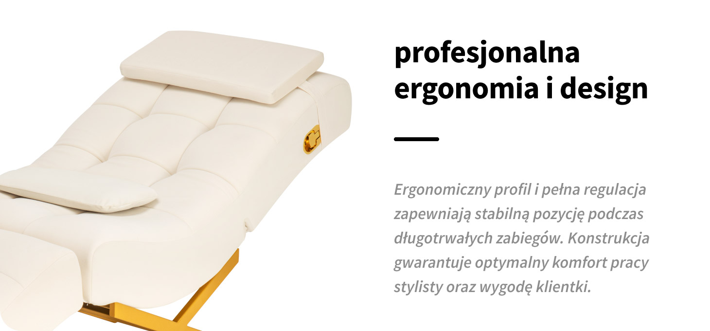 Ergonomicznie wyprofilowany materac zapewnia właściwe podparcie pleców i sprzyja rozluźnieniu mięśni, umożliwiając utrzymanie stabilnej oraz komfortowej pozycji przez cały czas trwania zabiegu. Przemyślana konstrukcja i możliwości regulacji wspierają prawidłową postawę pracy stylistki, pomagając ograniczyć napięcie w obrębie kręgosłupa i zmniejszyć zmęczenie przy dłuższych usługach. W zestawie znajdują się dwie poduszki, które dodatkowo podnoszą komfort ułożenia ciała i pozwalają lepiej dopasować pozycję do indywidualnych potrzeb klientki.