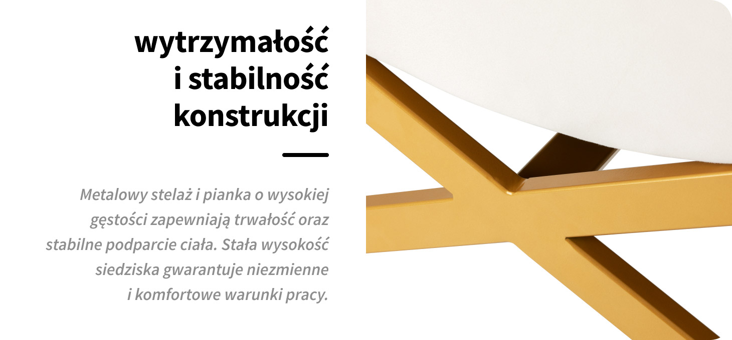 Fotel zabiegowy wypełniony został pianką o optymalnej twardości, zapewniającą stabilne i komfortowe podparcie ciała. Stała wysokość siedziska gwarantuje stabilne warunki pracy, a solidny metalowy stelaż w odcieniach złota odpowiada za trwałość oraz bezpieczeństwo użytkowania. Obicie z białego weluru podkreśla elegancki charakter wyposażenia. Klasyczne zestawienie kolorystyczne i pikowanie nadają całości luksusowy, ponadczasowy wygląd. Design łączy estetykę z funkcjonalnością, dzięki czemu fotel doskonale wpisuje się w profesjonalne wnętrza.