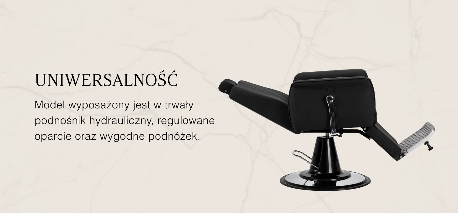 Wydajny podnośnik hydrauliczny umożliwia płynną regulację wysokości siedziska w zakresie 55-67 cm, nawet gdy klient już siedzi w fotelu. Zapewnia to ergonomiczne warunki pracy i ułatwia dopasowanie ustawień do wzrostu zarówno klienta, jak i barbera. Odchylane oparcie oraz regulowany podnóżek pozwalają na ułożenie klienta w wygodnej, półleżącej pozycji, zwiększając wygodę podczas wybranych usług. Regulowany zagłówek zapewnia stabilne podparcie głowy i karku.