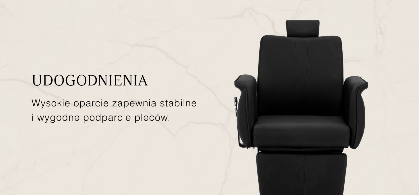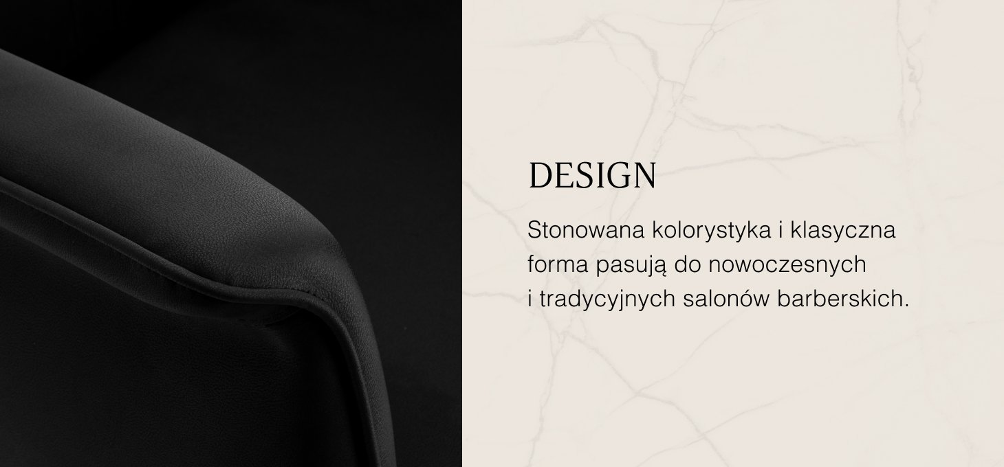 Stabilna, okrągła podstawa z metalowym wykończeniem zapewnia pewne podparcie i bezpieczeństwo użytkowania. Siedzisko, oparcie i podnóżek wypełnione pianką odporną na odkształcenia oraz obite czarną, przyjemną w dotyku skórą syntetyczną zapewniają trwałość oraz wysoki komfort użytkowania. Zastosowane materiały są odporne na wilgoć i łatwe w czyszczeniu, co sprawia, że fotel doskonale sprawdza się w codziennej pracy. Stonowana kolorystyka oraz klasyczna bryła pozwalają na harmonijne dopasowanie do wystroju nowoczesnych i tradycyjnych salonów barberskich.