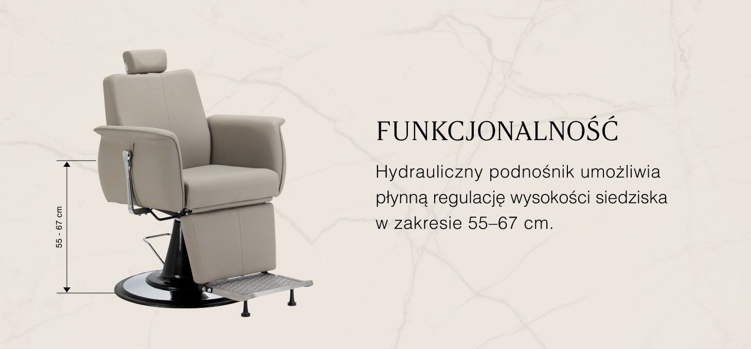 Wydajny podnośnik hydrauliczny umożliwia płynną regulację wysokości siedziska w zakresie 55-67 cm, nawet gdy klient już siedzi w fotelu. Zapewnia to ergonomiczne warunki pracy i ułatwia dopasowanie ustawień do wzrostu zarówno klienta, jak i barbera. Odchylane oparcie oraz regulowany podnóżek pozwalają na ułożenie klienta w wygodnej, półleżącej pozycji, zwiększając wygodę podczas wybranych usług. Regulowany zagłówek zapewnia stabilne podparcie głowy i karku.