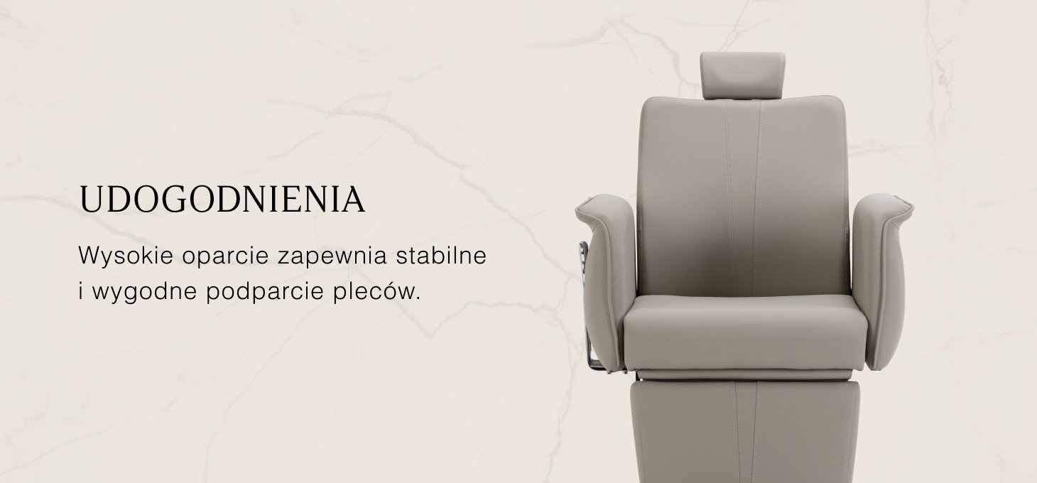 Komfortowe siedzisko zapewnia klientowi wygodę podczas różnorodnych usług. Wysokie oparcie oferuje solidne wsparcie pleców, sprzyjając wygodnej i stabilnej pozycji. Mechanizm pełnego obrotu zwiększa swobodę ruchu i usprawnia organizację pracy. Tapicerowane podłokietniki, umieszczone na optymalnej wysokości, wspomagają prawidłowe ułożenie ramion klienta, ograniczając napięcie w obrębie barków.