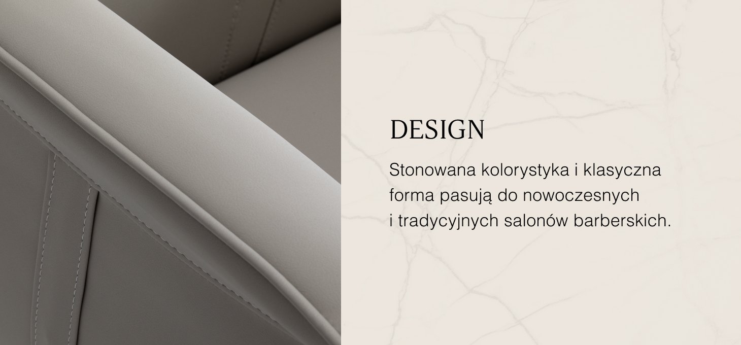 Stabilna, okrągła podstawa z metalowym wykończeniem zapewnia pewne podparcie i bezpieczeństwo użytkowania. Siedzisko, oparcie i podnóżek wypełnione pianką odporną na odkształcenia oraz obite szarą, przyjemną w dotyku skórą syntetyczną zapewniają trwałość oraz wysoki komfort użytkowania. Zastosowane materiały są odporne na wilgoć i łatwe w czyszczeniu, co sprawia, że fotel doskonale sprawdza się w codziennej pracy. Stonowana kolorystyka oraz klasyczna bryła pozwalają na harmonijne dopasowanie do wystroju nowoczesnych i tradycyjnych salonów barberskich.