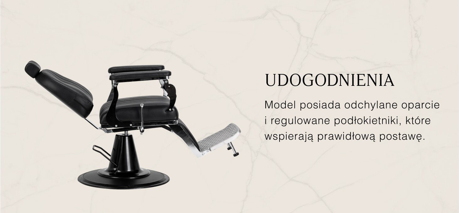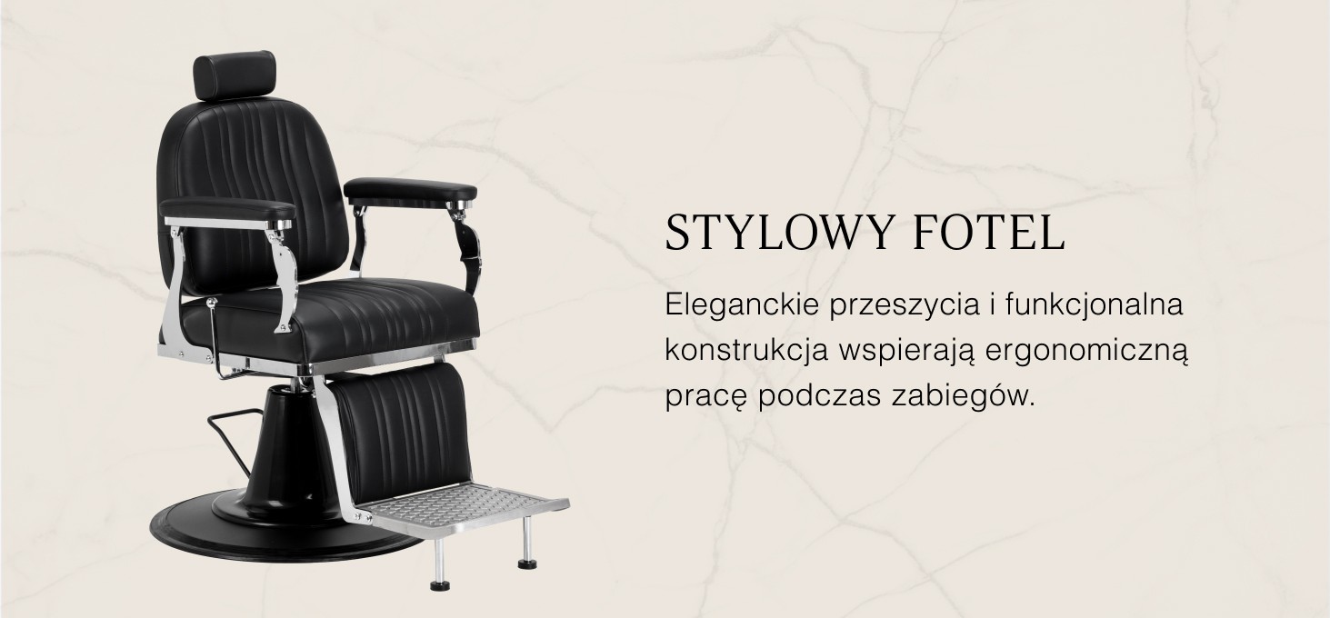 Stabilna podstawa zapewnia pewne podparcie i wysoki komfort użytkowania. Siedzisko wypełnione pianką odporną na odkształcenia oraz tapicerka z półmatowej skóry syntetycznej gwarantują trwałość i wygodę przez długi czas. Materiały wyróżniają się odpornością na wilgoć oraz łatwością utrzymania w czystości. Czarna tapicerka zestawiona z metalowymi, chromowanymi elementami oraz dekoracyjnym podnóżkiem nadaje fotelowi wyrazisty, klasyczny charakter. Pionowe przeszycia podkreślają stylistykę vintage, doskonale wpisującą się w klimat profesjonalnych salonów barberskich. Starannie dopracowane detale nadają całości reprezentacyjny wygląd, a funkcjonalna konstrukcja sprzyja komfortowej i efektywnej pracy.