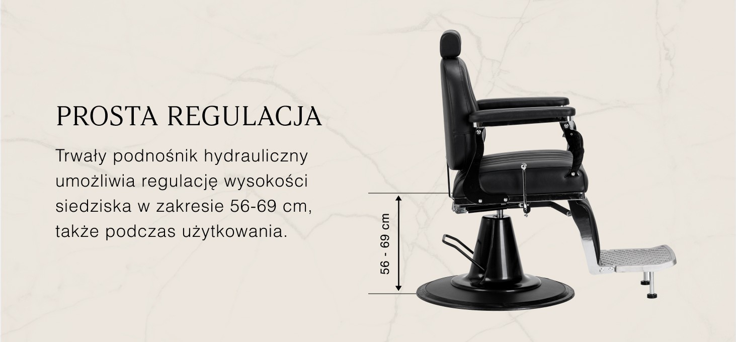 Trwały podnośnik hydrauliczny pozwala na swobodną regulację wysokości siedziska w zakresie 56-96 cm, również w czasie, gdy klient siedzi na fotelu. Gwarantuje to ergonomię pracy oraz łatwe dopasowanie poziomu siedziska do wzrostu klienta i osoby wykonującej zabieg. Model wyposażono w odchylane oparcie oraz regulowany podnóżek, co pozwala na ułożenie klienta w komfortowej, półleżącej pozycji i zapewnia lepszy dostęp podczas wybranych usług. Dodatkowo zagłówek z możliwością wysunięcia o 20 cm gwarantuje stabilne i wygodne podparcie głowy, dopasowane do indywidualnych potrzeb.