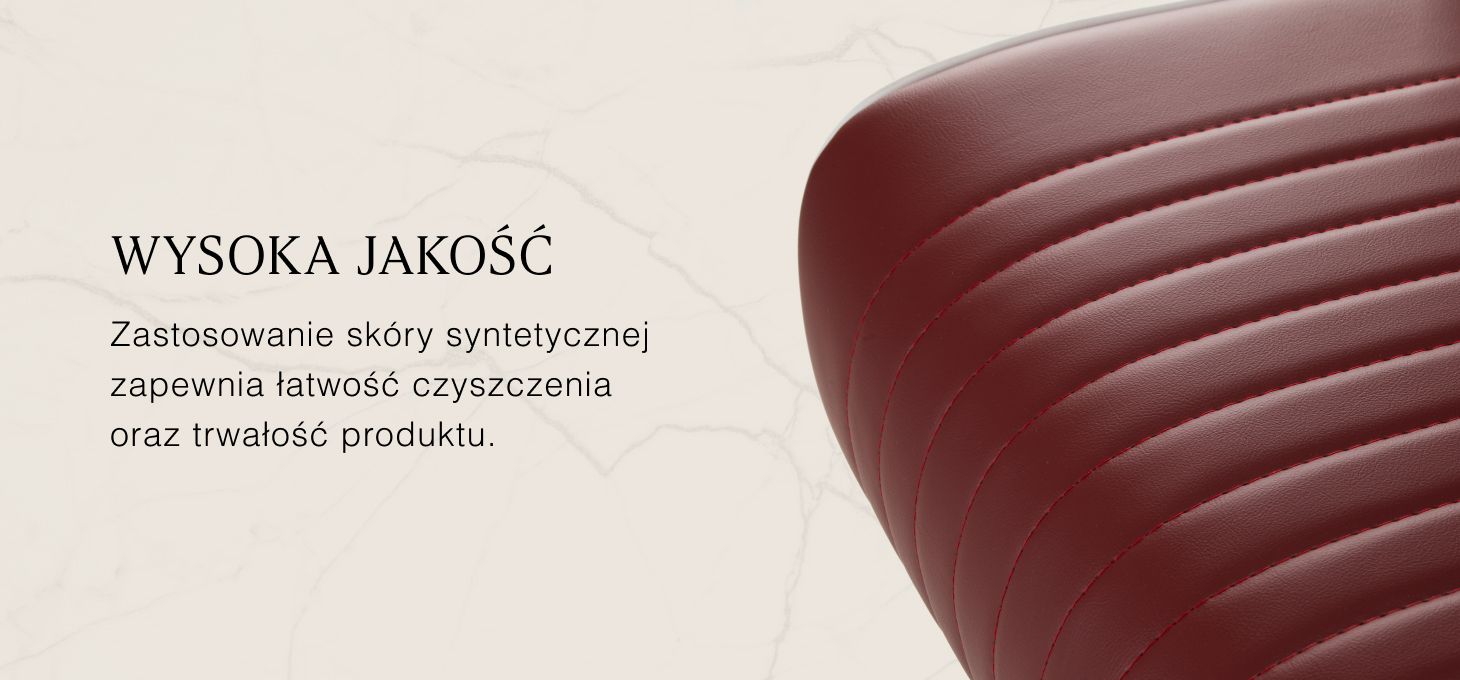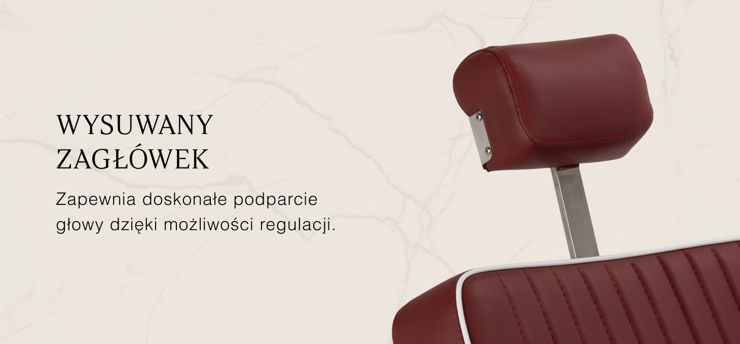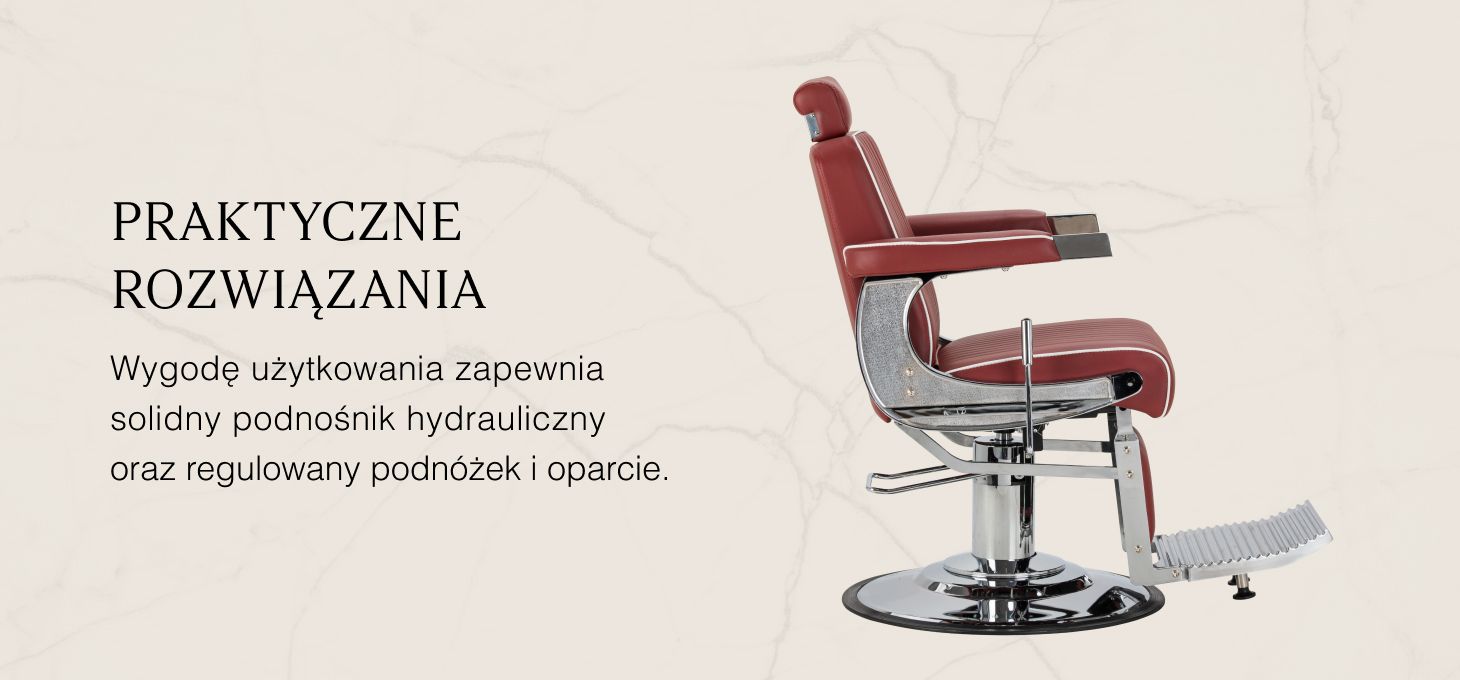 Solidna konstrukcja podstawy zapewnia stabilność oraz wysoki komfort użytkowania. Siedzisko wypełnione odporną na odkształcenia pianką oraz obite miękką, matową skórą syntetyczną łączy trwałość z komfortem. Materiały użyte do wykończenia są odporne na wilgoć, wytrzymałe i łatwe w czyszczeniu, co sprawia, że fotel doskonale sprawdza się w codziennej pracy. Stylowe przeszycia i tapicerka w odcieniach czerwieni nadają mu wyjątkowego charakteru, idealnie komponującego się z wystrojem nowoczesnych salonów barberskich.