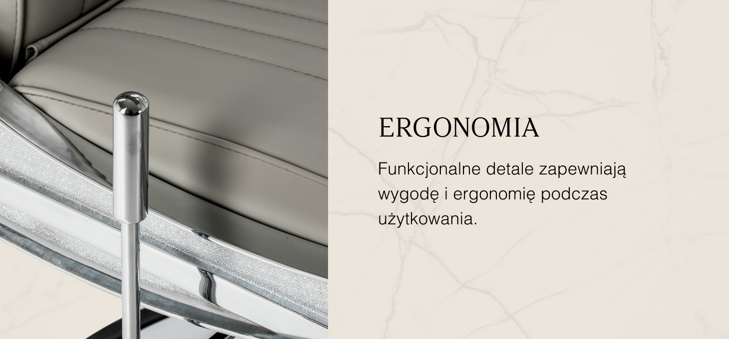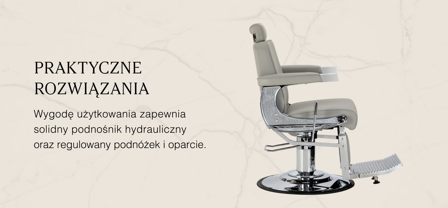 Solidna konstrukcja podstawy zapewnia stabilność oraz wysoki komfort użytkowania. Siedzisko wypełnione odporną na odkształcenia pianką oraz obite miękką, matową skórą syntetyczną łączy trwałość z komfortem. Materiały użyte do wykończenia są odporne na wilgoć, wytrzymałe i łatwe w czyszczeniu, co sprawia, że fotel doskonale sprawdza się w codziennej pracy. Stylowe przeszycia i tapicerka w odcieniach szarości nadają mu wyjątkowego charakteru, idealnie komponującego się z wystrojem nowoczesnych salonów barberskich.