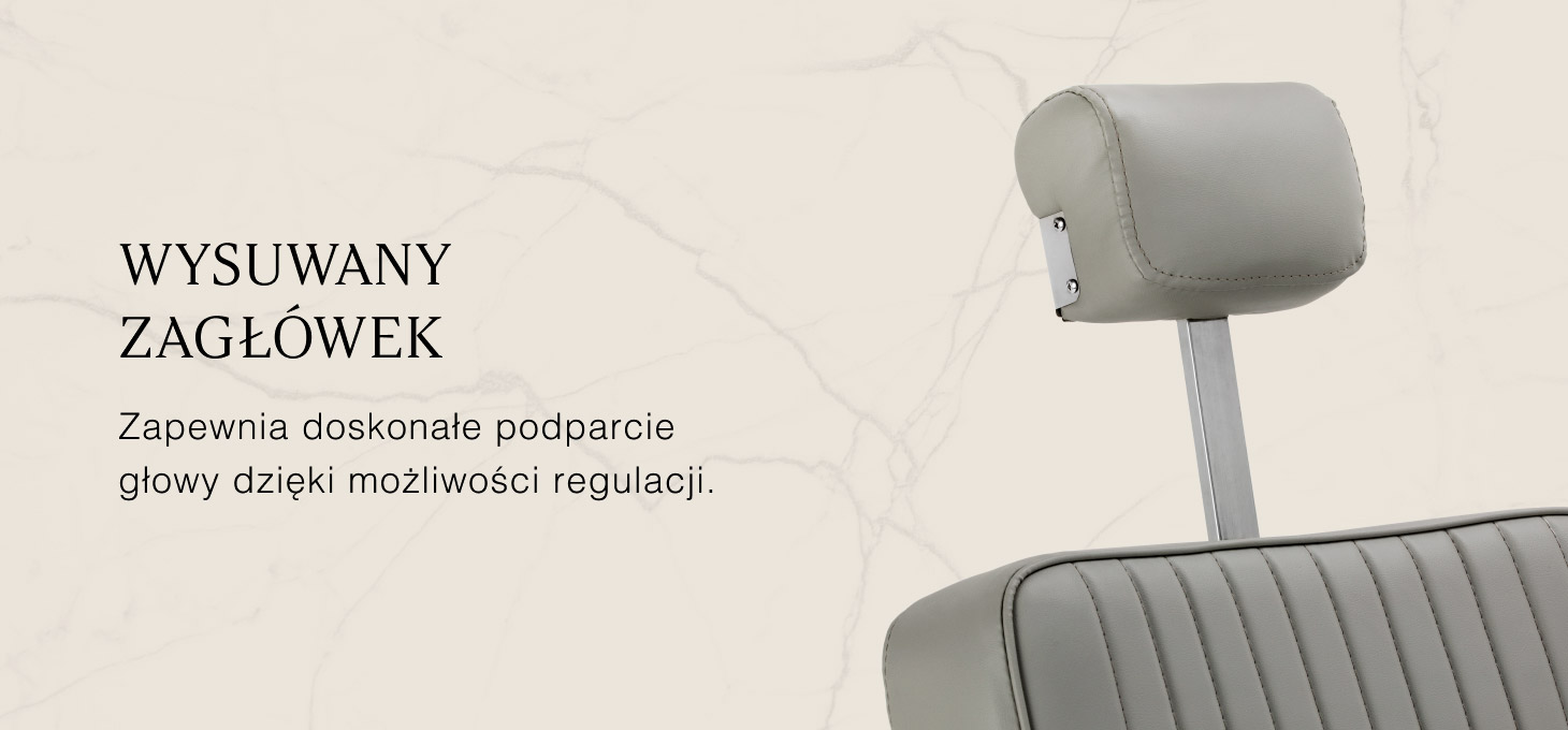 Wydajny podnośnik hydrauliczny umożliwia swobodną regulację wysokości siedziska w granicach 55-72 cm, nawet gdy klient już siedzi na fotelu. Pozwala to na ergonomiczne dopasowanie fotela do wzrostu klienta oraz preferencji osoby wykonującej zabieg. Odchylane oparcie i regulowany podnóżek umożliwiają ustawienie klienta w komfortowej, półleżącej pozycji, co ułatwia dostęp podczas bardziej precyzyjnych usług. Dodatkowe wsparcie zapewnia wysuwany zagłówek, gwarantujący stabilne podparcie głowy.