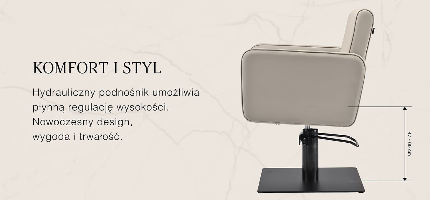 Trwały podnośnik hydrauliczny pozwala na płynną regulację wysokości siedziska w zakresie od 47 do 60 cm – również gdy klient znajduje się na fotelu. Dzięki temu praca staje się bardziej ergonomiczna, a pozycję można łatwo dopasować zarówno do wzrostu klienta, jak i fryzjera. Wygodne oparcie zapewnia stabilne podparcie pleców i ułatwia przyjęcie komfortowej pozycji, co jest szczególnie istotne podczas długich zabiegów, zwiększając komfort i satysfakcję klienta.