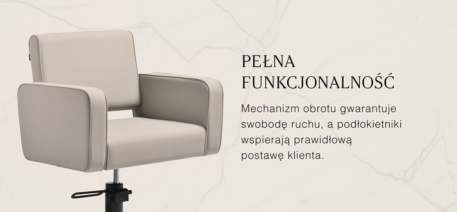 Siedzisko gwarantuje komfort nawet podczas wielogodzinnych zabiegów. Ergonomiczne podłokietniki wspierają prawidłową postawę klienta, zapewniając wygodę i ułatwiając precyzyjne cięcia oraz stylizacje. Mechanizm pełnego obrotu zapewnia większą mobilność i swobodę ruchów, sprawiając, że praca fryzjera jest płynniejsza, bardziej efektywna i mniej obciążająca. Dodatkowym udogodnieniem jest praktyczny otwór między oparciem a siedziskiem, który ułatwia utrzymanie czystości i szybkie usuwanie włosów z trudno dostępnych miejsc. Dzięki temu przygotowanie stanowiska na kolejnego klienta przebiega sprawnie i higienicznie.