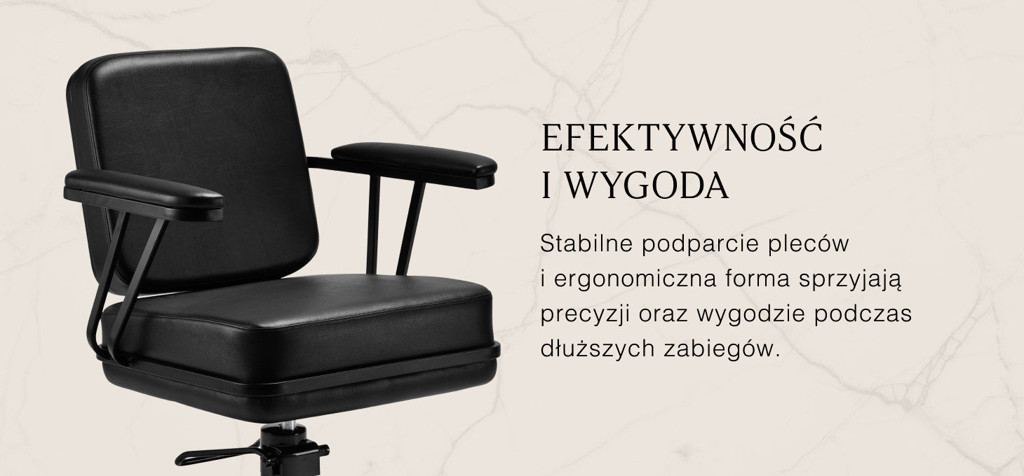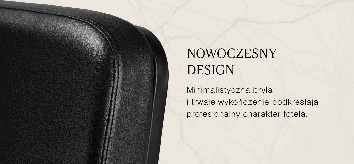 Wyprofilowany fotel zapewnia wsparcie lędźwi i wysoki komfort użytkowania, a tapicerowane podłokietniki umożliwiają prawidłowe ułożenie barków klienta. Stabilna, kwadratowa podstawa w matowej czerni podkreśla stylowy wygląd, a przyjemna w dotyku skóra syntetyczna w odcieniach czerni gwarantuje wygodę podczas długich zabiegów, trwałość, odporność na wilgoć i łatwość czyszczenia. Nowoczesny design nadaje wnętrzu wyjątkowego charakteru, a fotel sprawdza się zarówno w nowoczesnych, jak i klasycznych aranżacjach, podkreślając profesjonalny wizerunek salonu.