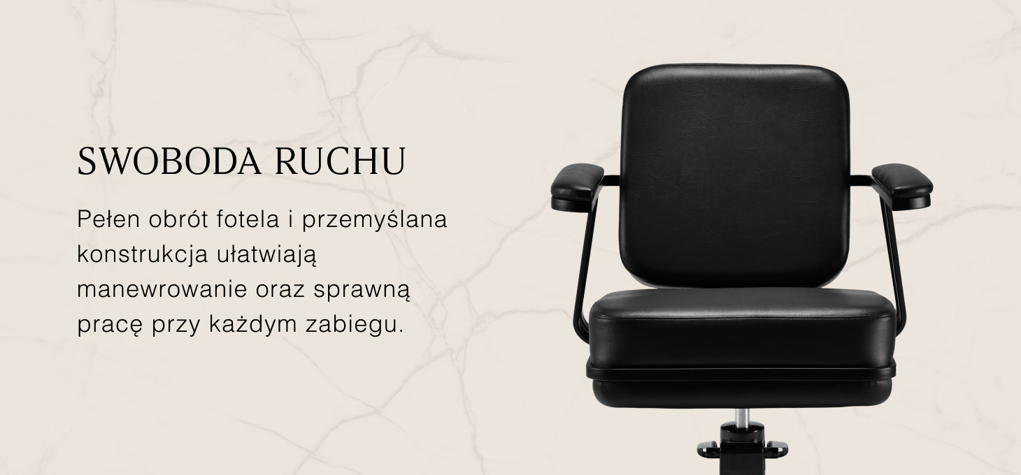 Konstrukcja fotela została zaprojektowana z myślą o komforcie nawet podczas dłuższych zabiegów. Wyprofilowane siedzisko i ergonomiczne podłokietniki wspierają naturalną postawę klienta, ułatwiając precyzyjną pracę fryzjera. Mechanizm pełnego obrotu zwiększa zakres ruchu i swobodę manewrowania, co przekłada się na płynność i efektywność usług.